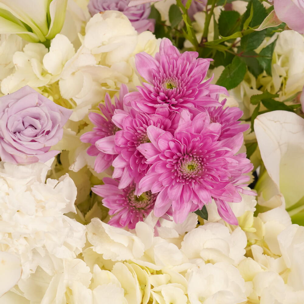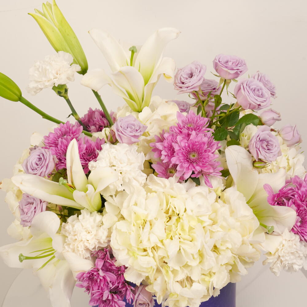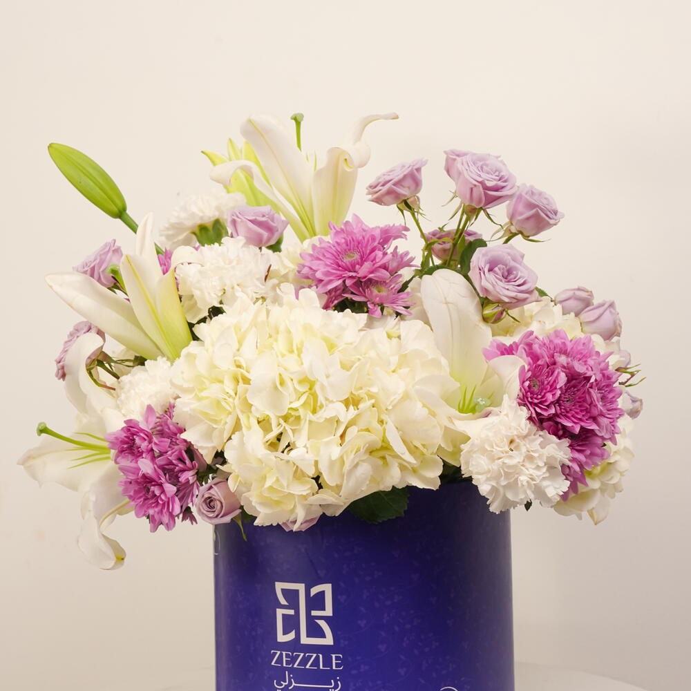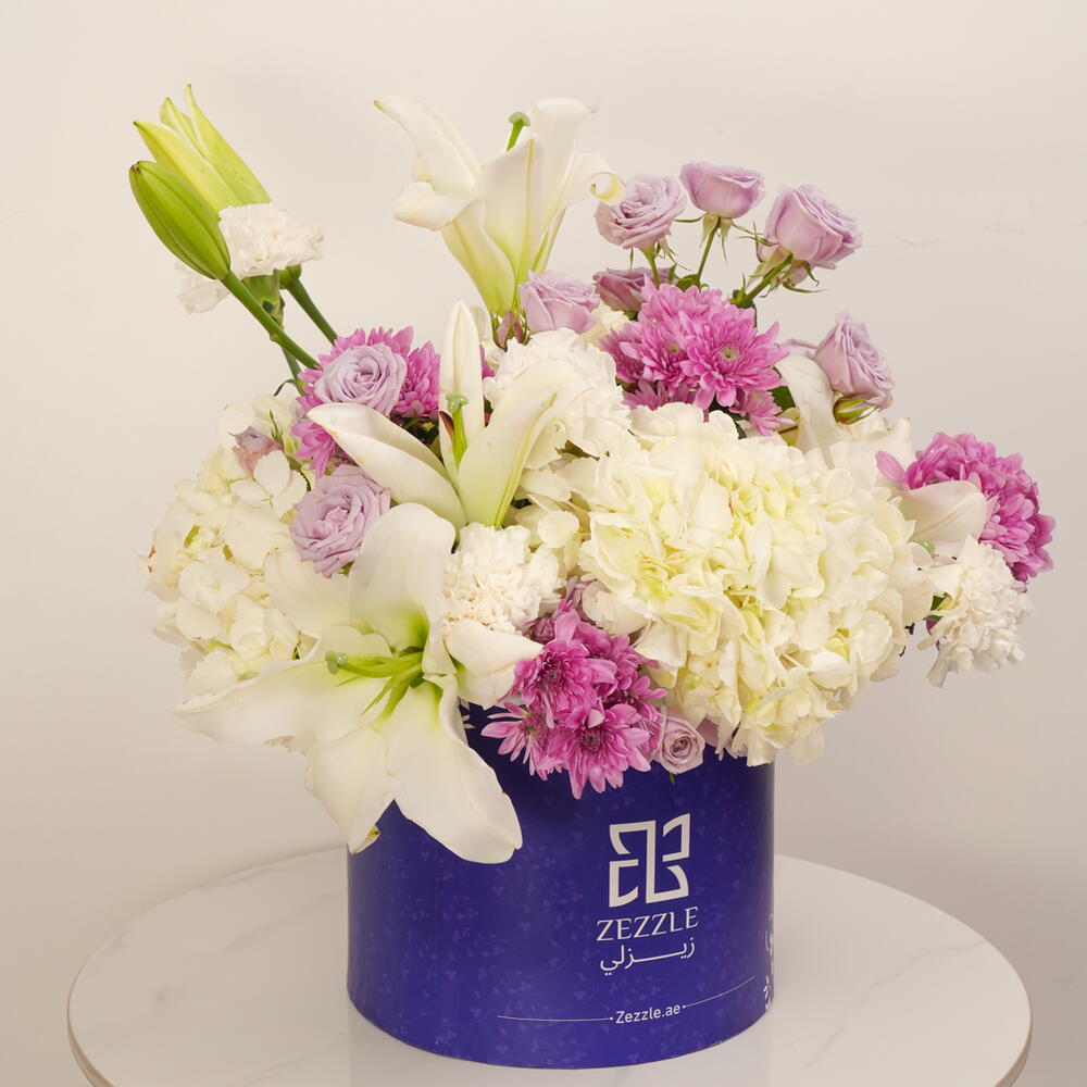 Experience the beauty of Lavender Bliss, a luxurious arrangement featuring 3 white hydrangeas, 10 purple chrysanthemums, 15 purple spray roses, 5 white lilies, and 10 white carnations, elegantly presented in a blue Zezzle round box. Perfect for gifts and special occasions, delivered across the UAE.