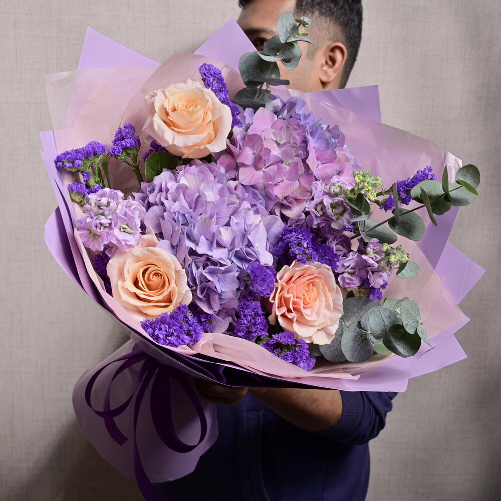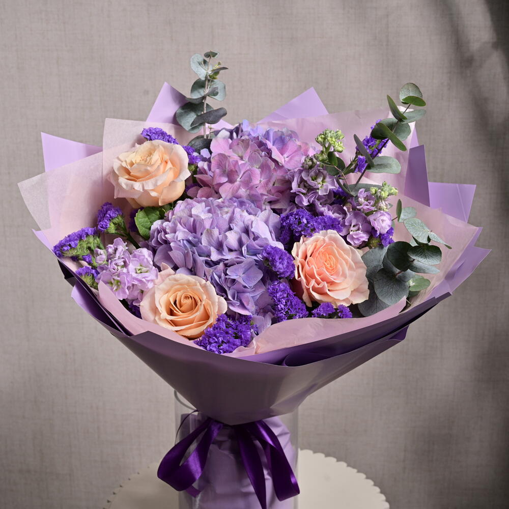 A captivating bouquet of soft lavender hues featuring hydrangeas, Ecuadorian roses, and statice, complemented with light purple matthiola and eucalyptus for an elegant touch.