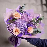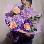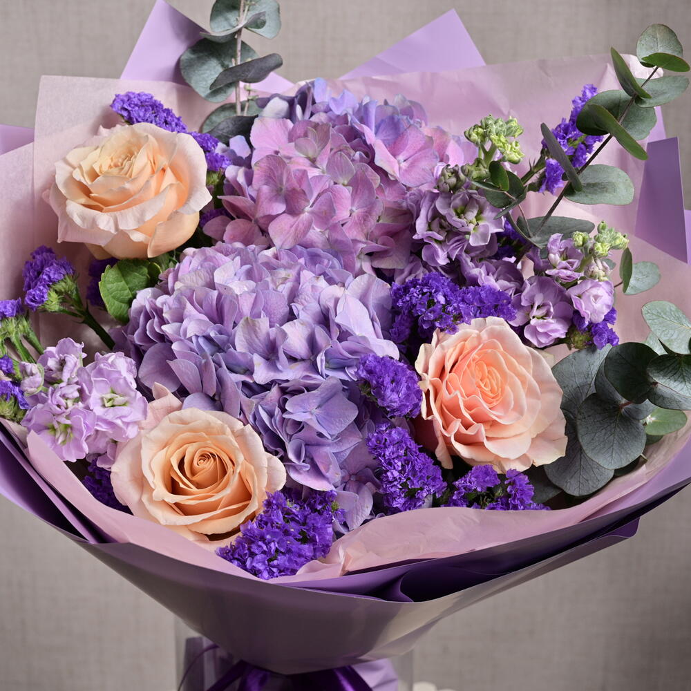 Ribbon - 1 pcs Eucalyptus - 3 pcs Hydrangea - 2 pcs wrapping paper - 5 pcs ecuadorian roses - 3 pcs light purple matthiola - 3 pcs dark purple statice - 3 pcs