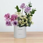 white hydrangea - 1 pcs ruscus leaves - 5 pcs eucalyptus stems - 2 pcs purple roses - 6 pcs white spray roses - 6 pcs