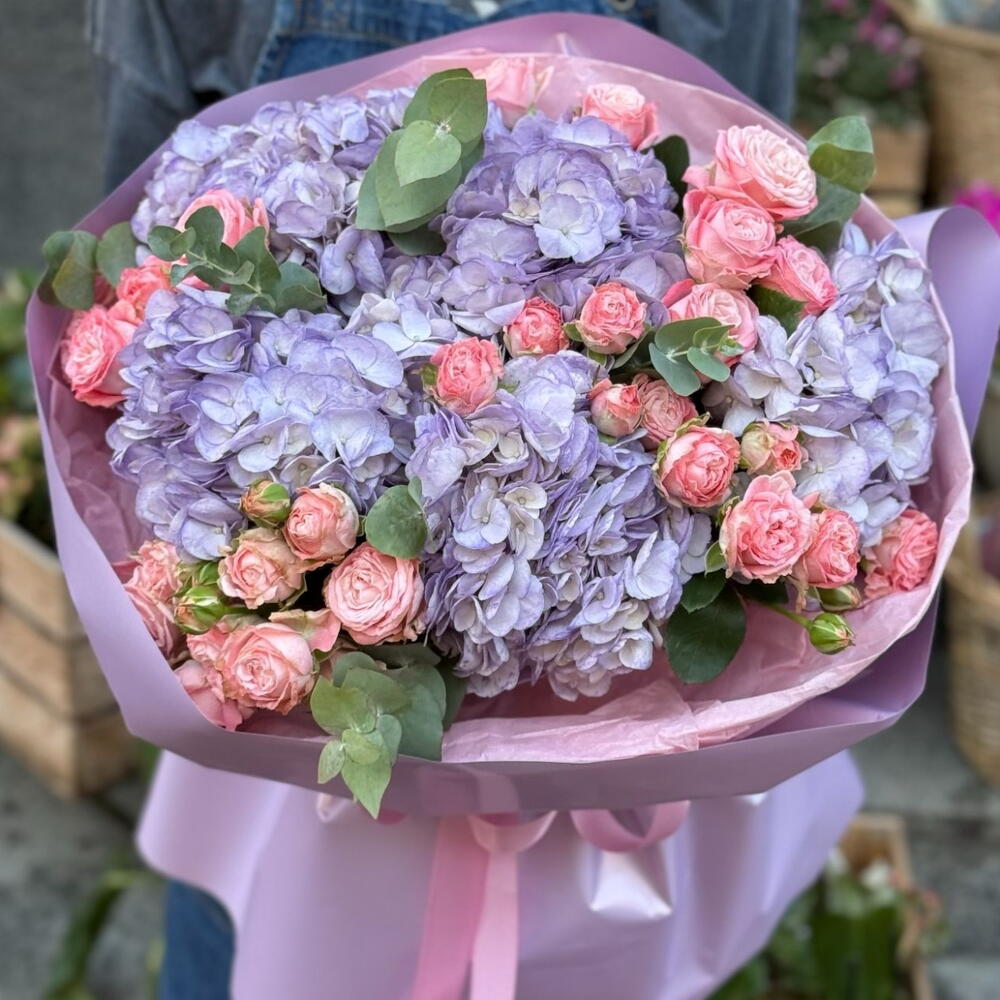 eucalyptus leaves - 5 pcs purple hydrangea - 5 pcs pink spray roses - 21 pcs