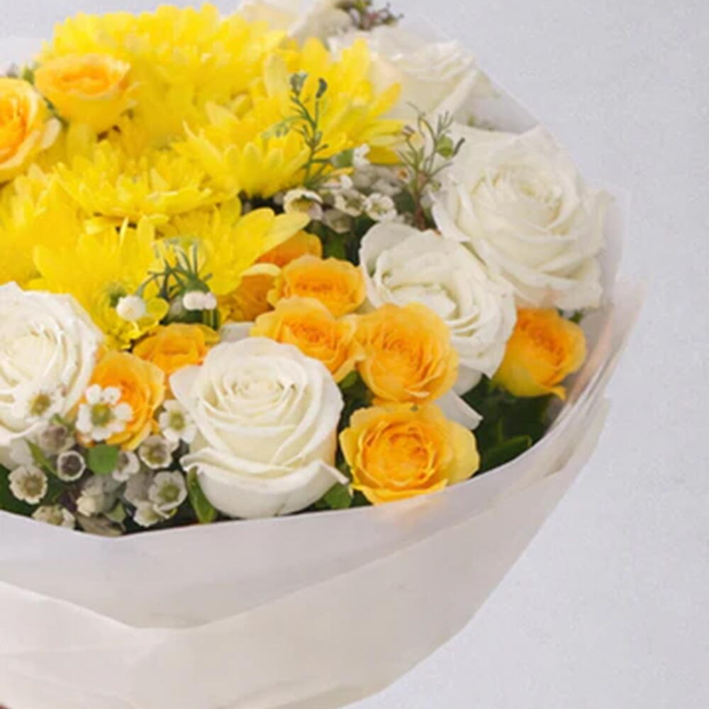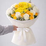 Lemon Cream Bliss is a radiant bouquet that captures the warmth of sunshine and the elegance of soft neutrals. Featuring a harmonious blend of buttery yellow chrysanthemums, creamy white roses, and delicate yellow spray roses, this arrangement is thoughtfully accented with airy white fillers for a fresh, graceful finish. Wrapped in soft ivory-toned paper and tied with a satin ribbon, this bouquet exudes understated luxury—perfect for birthdays, celebrations, or simply brightening someone’s day. Its gentle palette and refined presentation make it a timeless choice for any occasion.