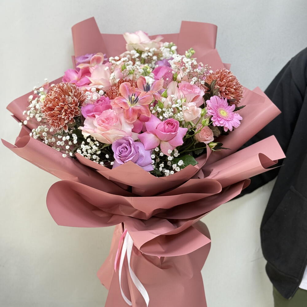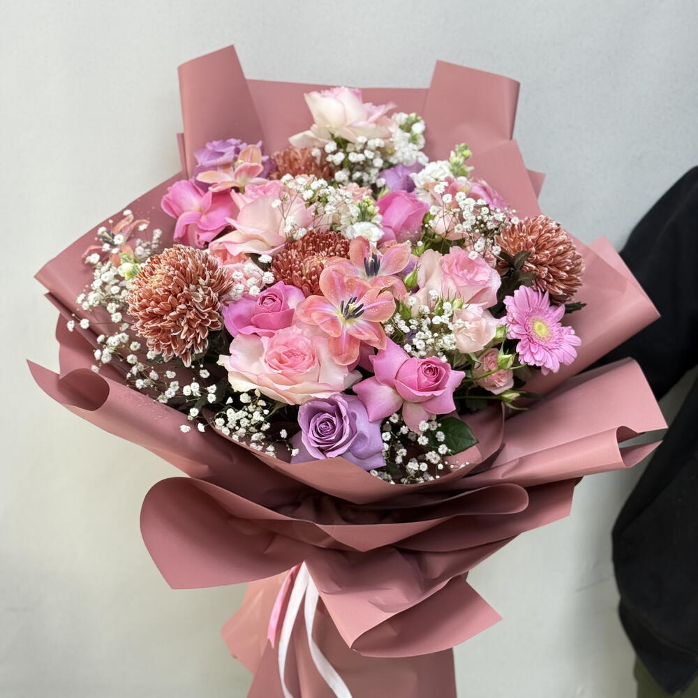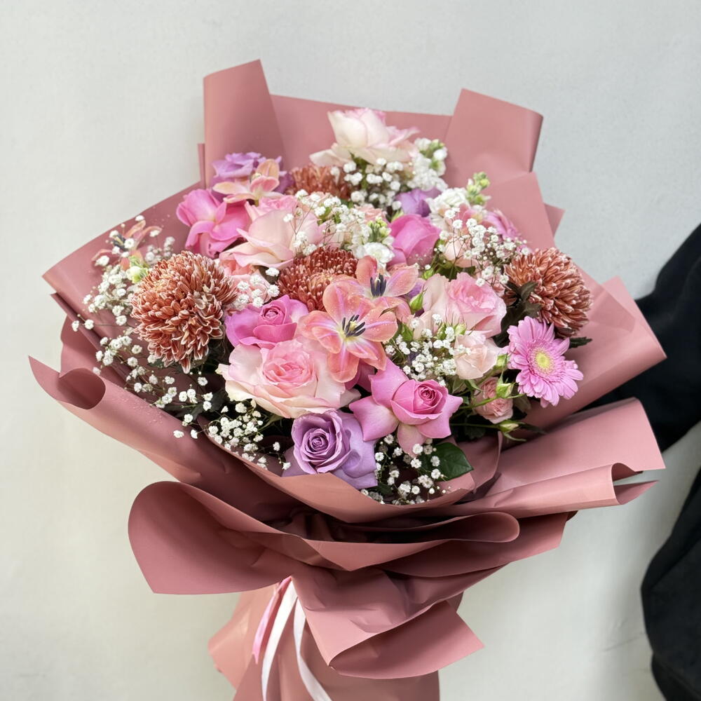 Tulips - 5 pcs purple rose - 5 pcs gerbera pink - 2 pcs baby rose pink - 2 pcs gepsofilia - 5 pcs light pink roses - 5 pcs esperance roses - 5 pcs chrysanthemum brown - 4 pcs