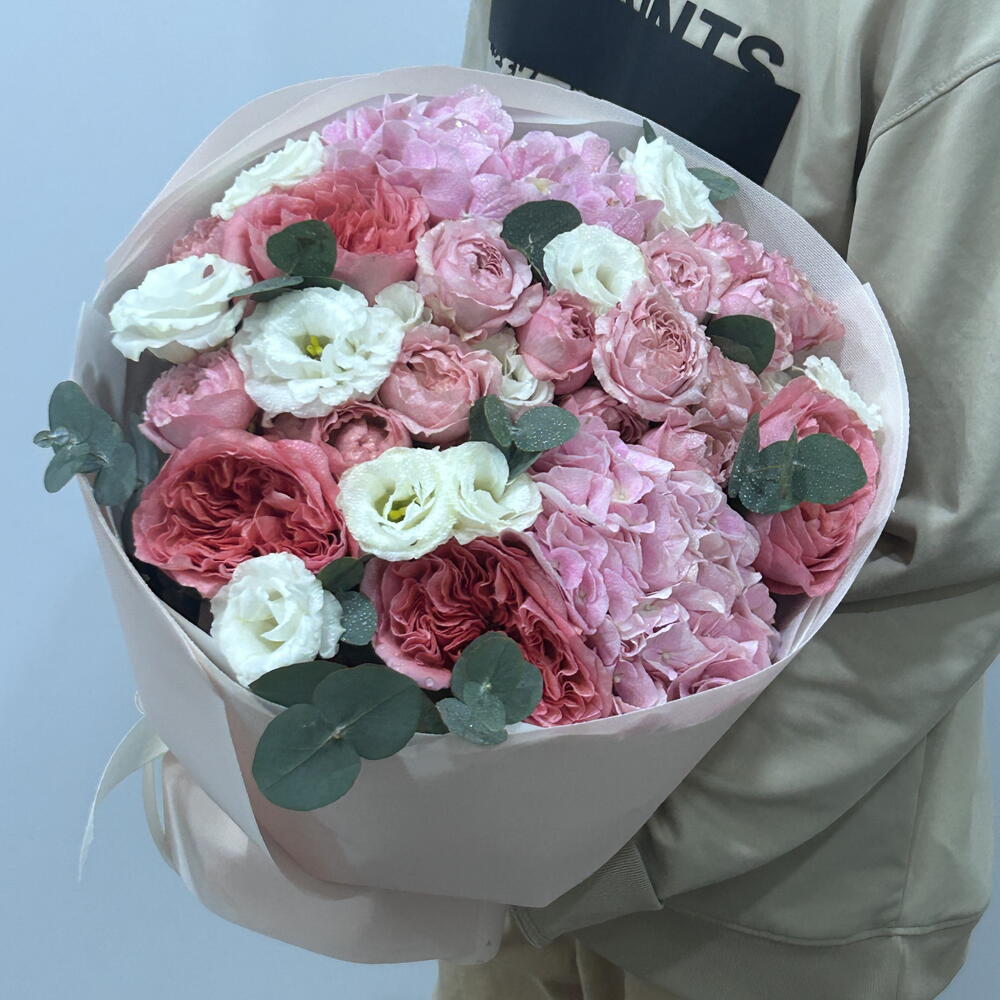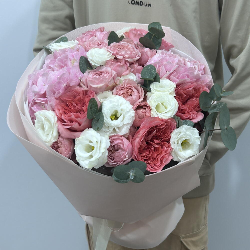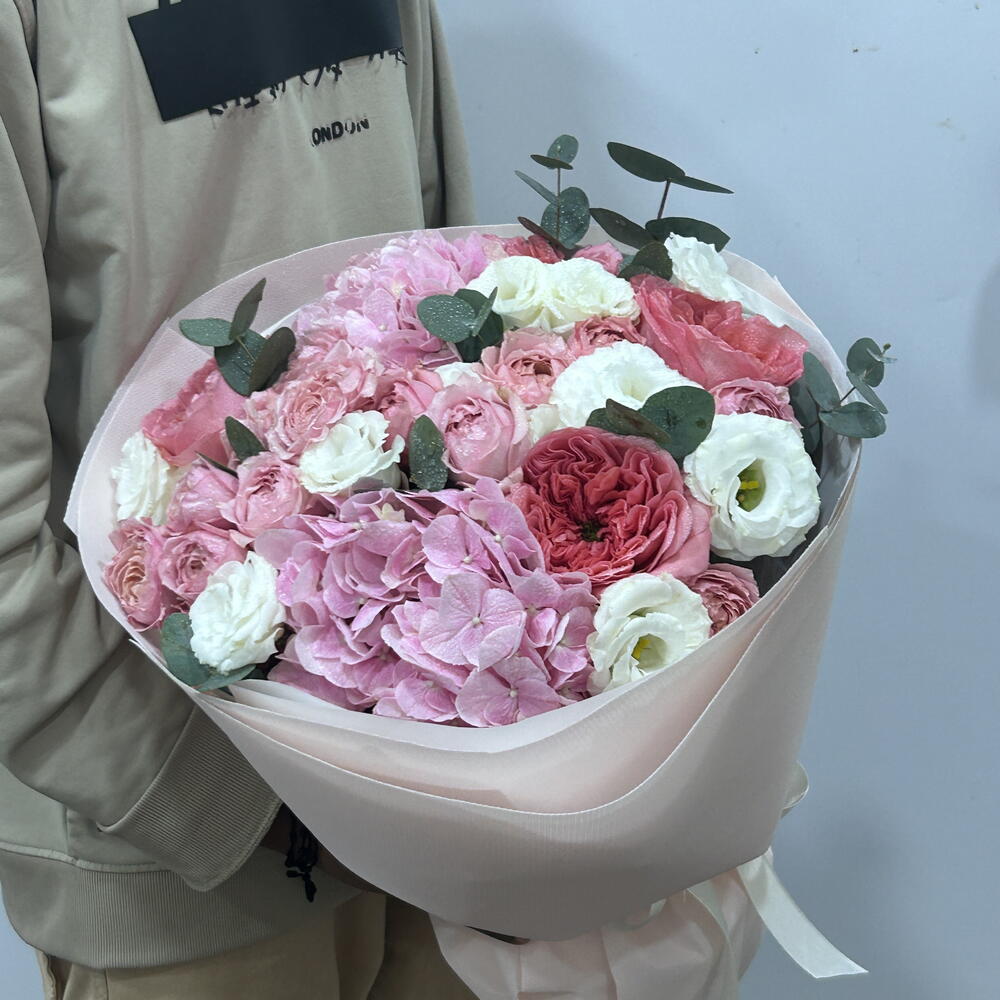 Lisianthus - 3 pcs wrapping paper - 4 pcs pink expression - 5 pcs pink hydrangea - 2 pcs julietta spray rose - 3 pcs eulcyptus - 4 pcs