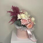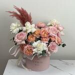 Eucalyptus - 1 pcs rose white - 4 pcs spray rose julietta - 3 pcs pampas pink - 1 pcs rose ohara pink - 5 pcs circle pink box - 1 pcs