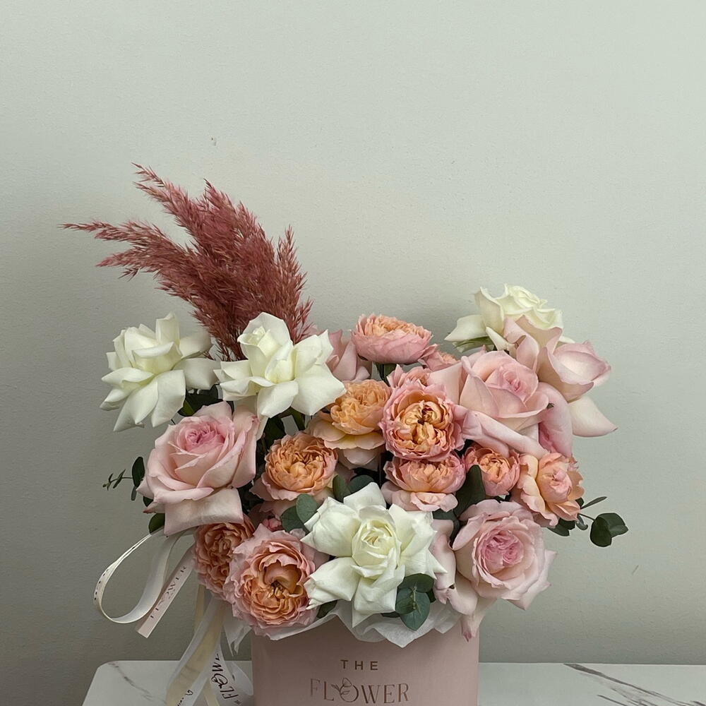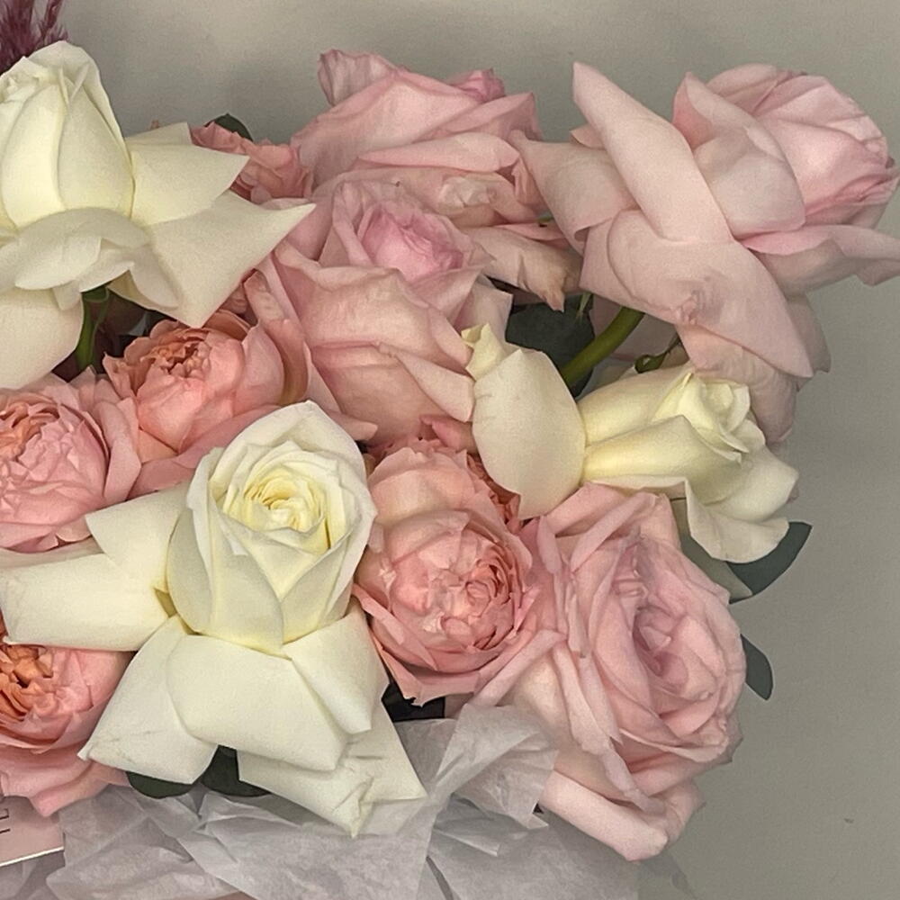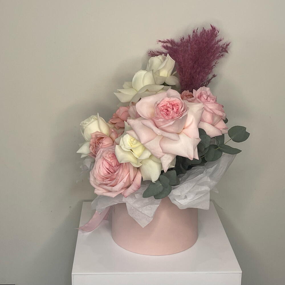 Eucalyptus - 1 pcs rose white - 4 pcs spray rose julietta - 3 pcs pampas pink - 1 pcs rose ohara pink - 5 pcs circle pink box - 1 pcs