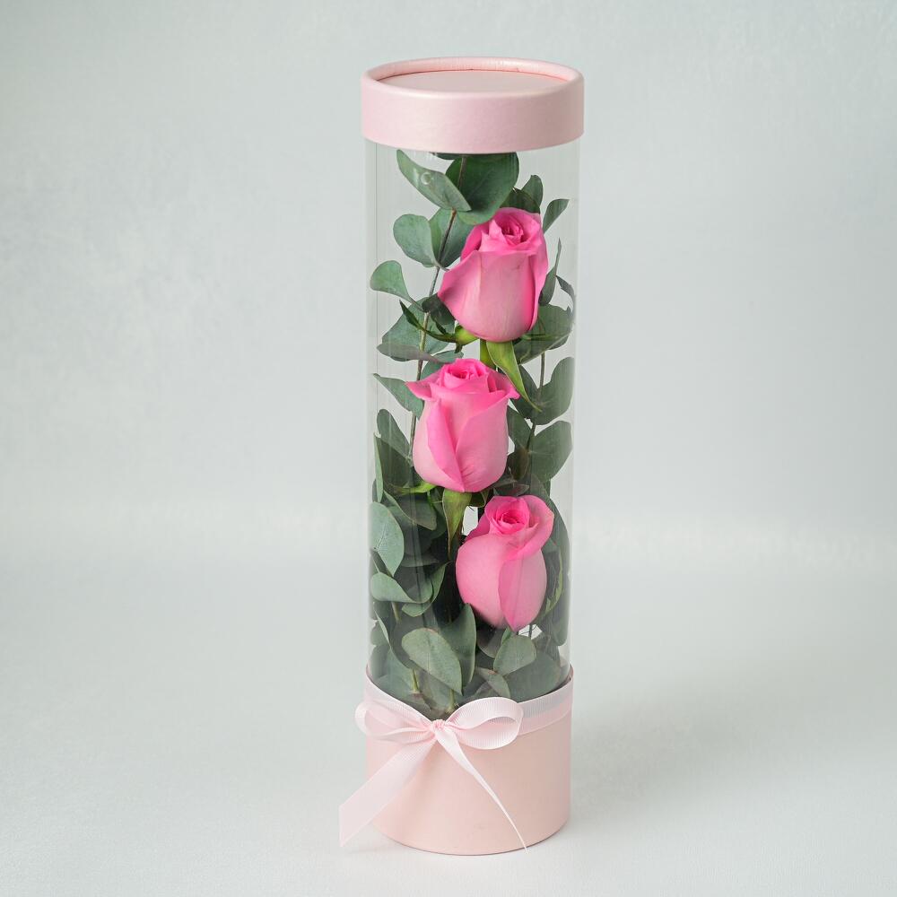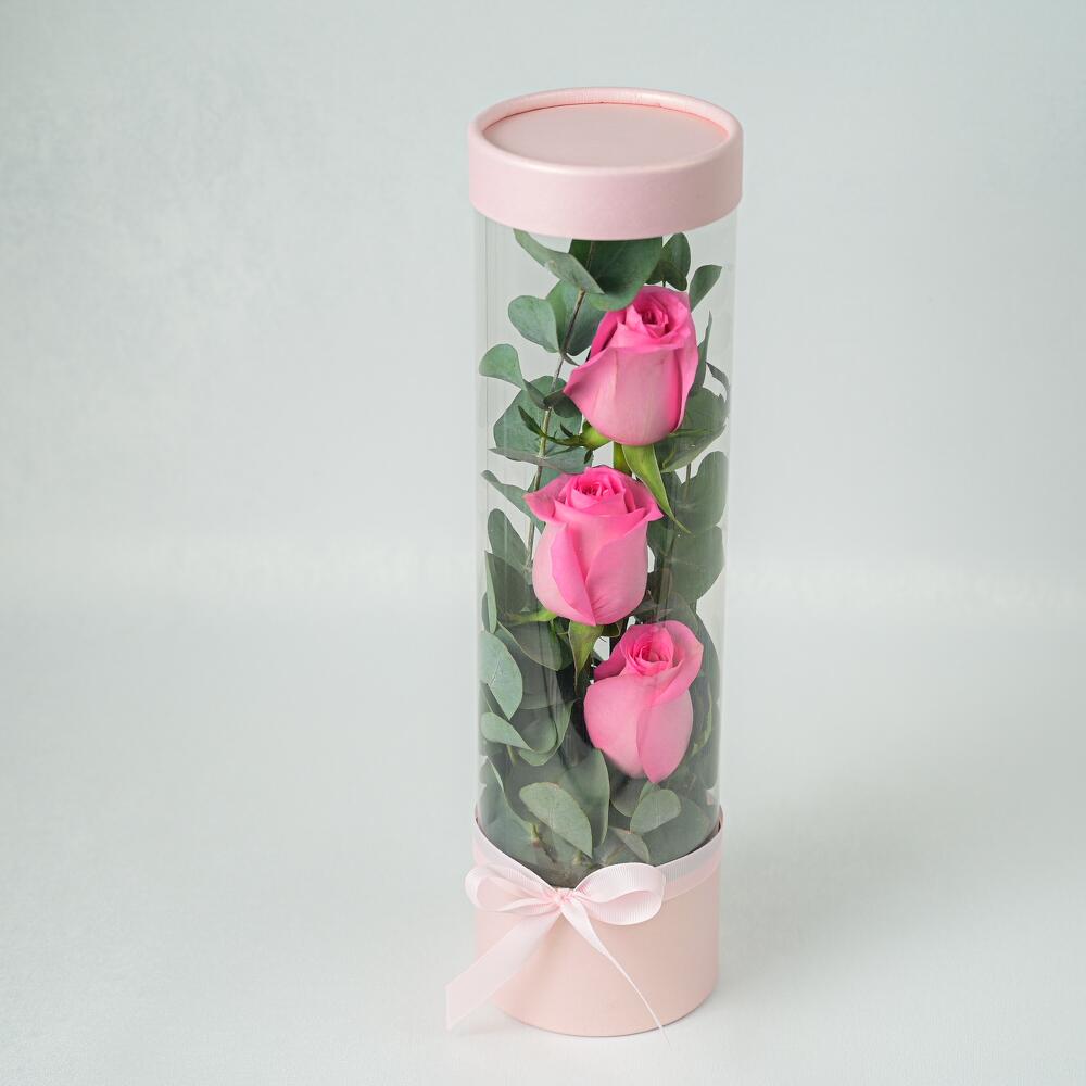 Ribbon - 1 pcs Eucalyptus - 2 pcs flower box - 1 pcs light pink rose - 3 pcs