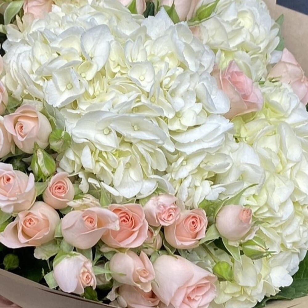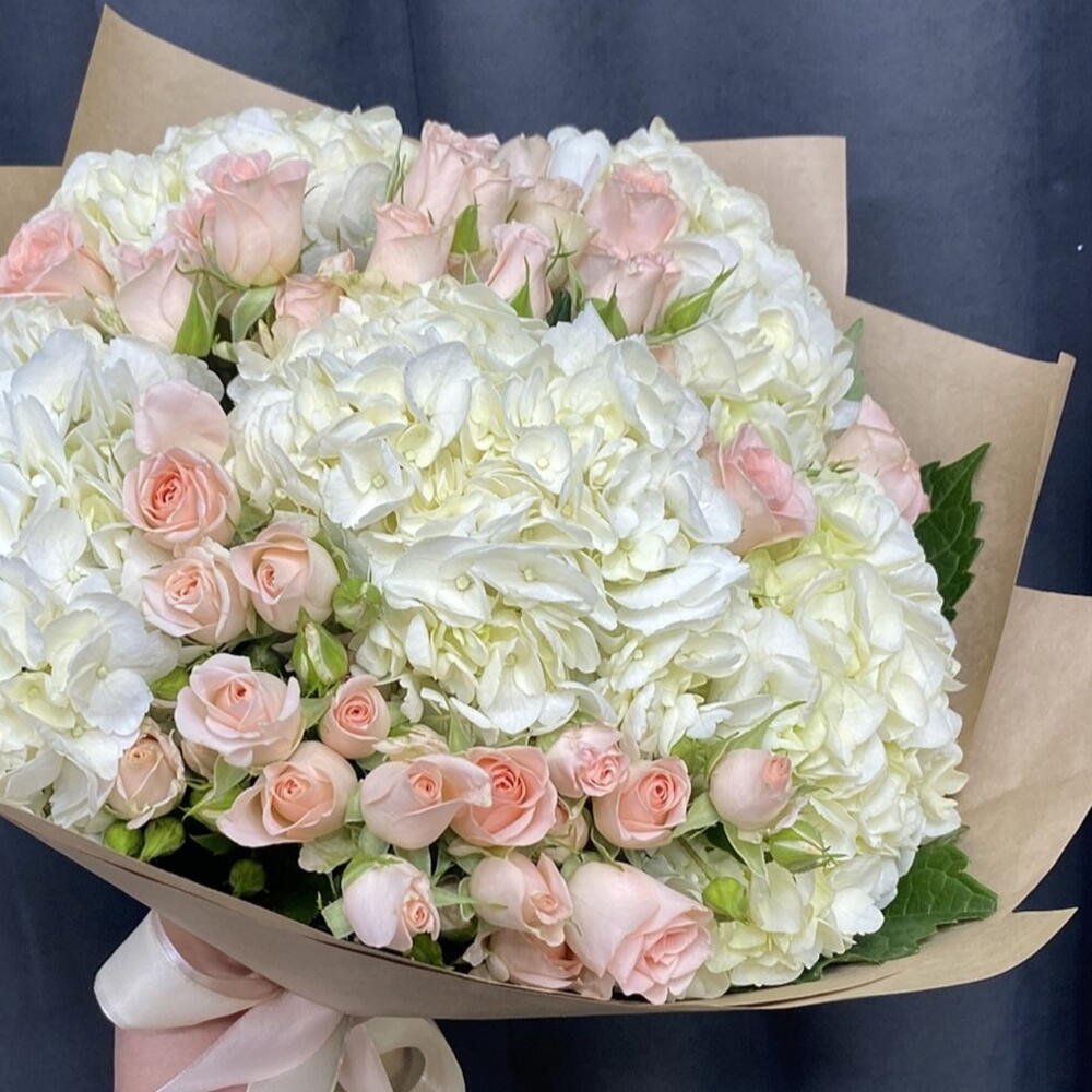 Elegant design: Delicate pastel shades of roses and voluminous hydrangea blooms create a harmonious combination that will delight the eye and lift the spirits. Longevity: Shrub roses and hydrangeas are known for their durability, allowing you to enjoy the beauty of your bouquet for longer. Versatility: This bouquet is suitable for both special occasions and everyday gifts. It will symbolize your care and attention.