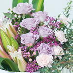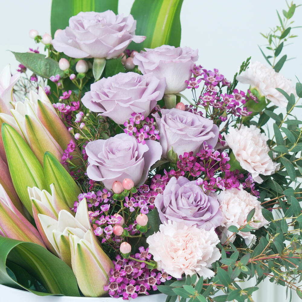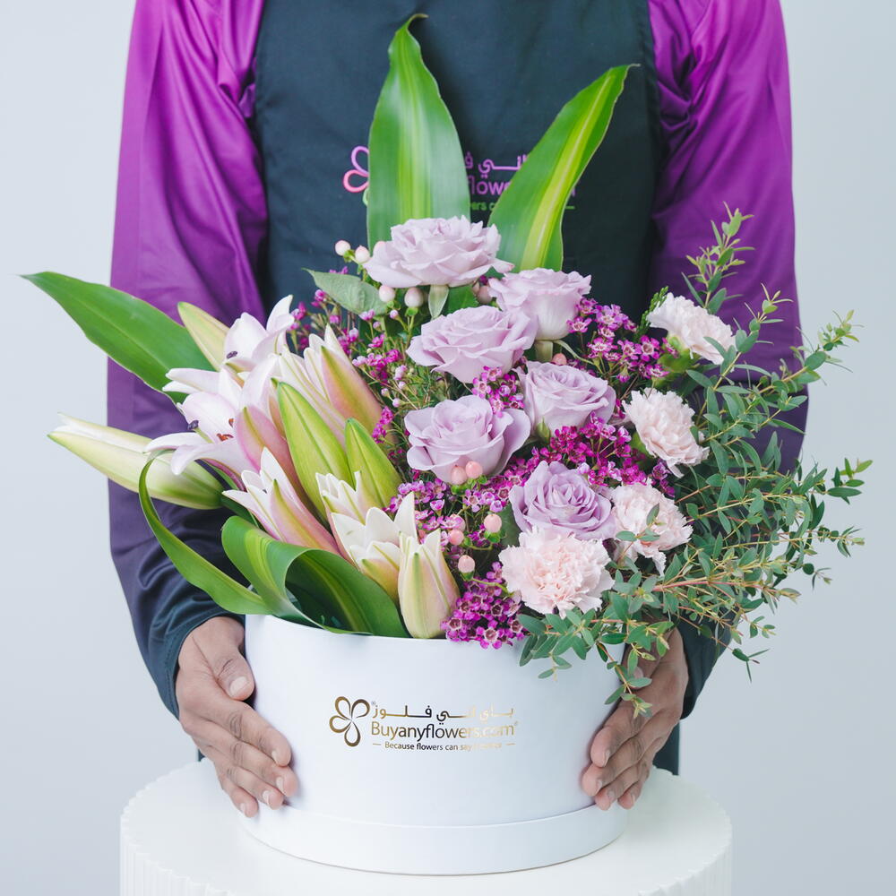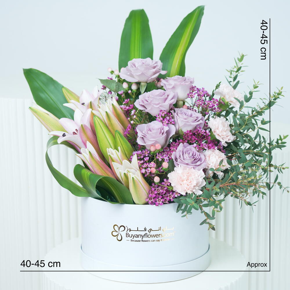 6 Light Purple Roses 3 Pink Oriental Lilies 4 Light Pink Carnations 2 Stems Purple Wax Flower 5 Dracaena Massangeana Leaves 2 Stems Palvifolia Leaves 3 Stems Pink Hypericum Arranged In White Medium Box Dimensions Height – 40 Cm Width – 43 Cm White Medium Box- Diameter- 28 cm ,Height- 20 cm