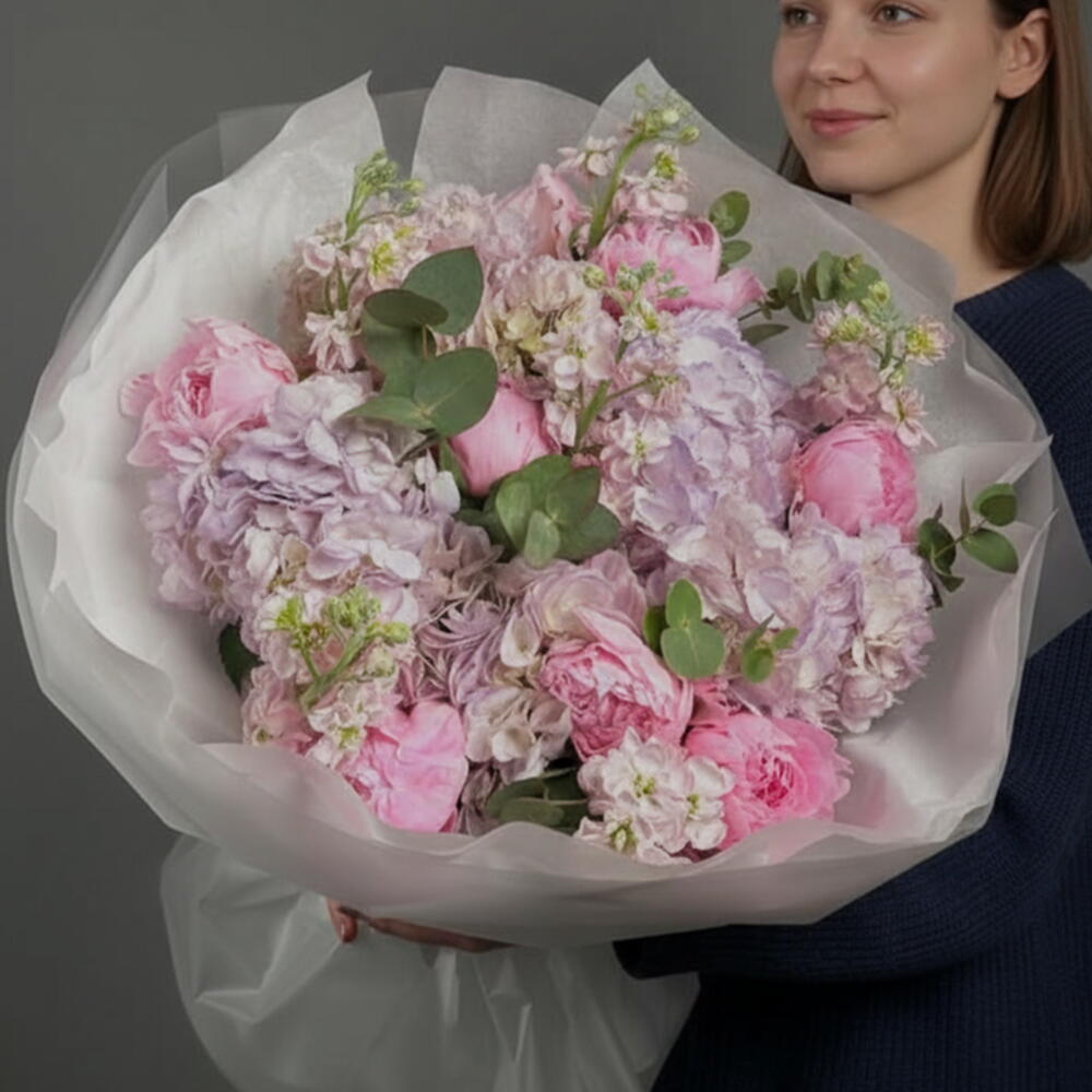 Eucalyptus - 4 pcs Hydrangea - 4 pcs Peony - 6 pcs metholia - 6 pcs