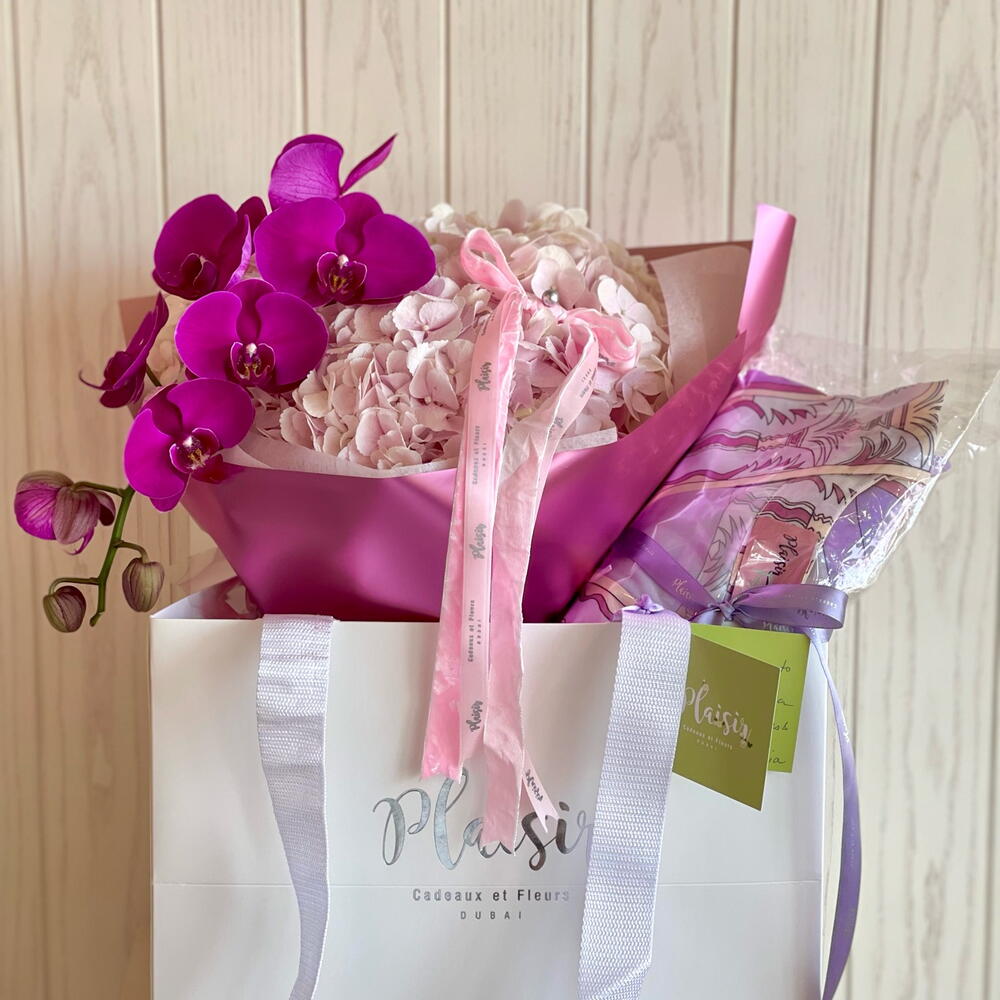 Lilac gift set of Pink Hydrangeas Orchids and Kaftan