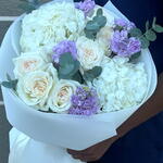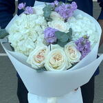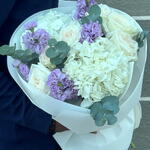 hydrangea white - 2 pcs wrapping paper - 3 pcs white ohara - 6 pcs eucalyptus leaves - 3 pcs mathiola purple - 4 pcs