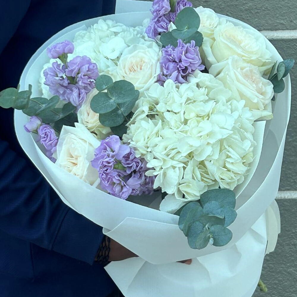 hydrangea white - 2 pcs wrapping paper - 3 pcs white ohara - 6 pcs eucalyptus leaves - 3 pcs mathiola purple - 4 pcs