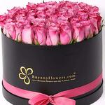 Product Details: 41-51 Purple Roses Arranged in a Round Black Box Ribbon Bow