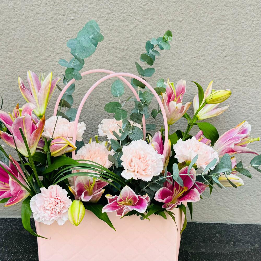 Lilies Carnation in a bag; 4 stems of pink lilies,12 stems of pink carnation with euclyptus fillers in a white bag