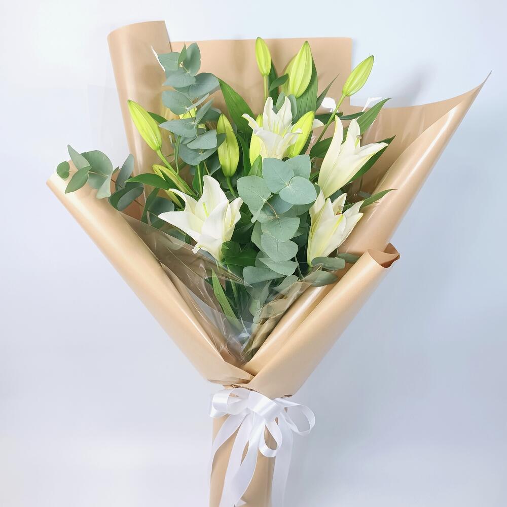 Clean, elegant, and beautifully fragrant—this stunning Mono bouquet is crafted with fresh white lilies (open blooms and buds) paired with airy eucalyptus greenery for a modern, minimalist look. Wrapped in premium beige paper and finished with a classic ribbon, it’s a sophisticated Fresh flowers bouquet (Fresh bouquet) made with premium quality and premium quality flowers—perfect when you want something timeless and graceful. A lovely choice as Birthday flowers and Flowers for birthday, it also works beautifully as a Congratulations bouquet with elegant Congratulations flowers for new beginnings and milestones. With its calm, classy style, it’s a cool bouquet and a truly unique flowers bouquet—ideal for customers searching for the best bouquet in dubai, and a wonderful option for best flowers for anniversary as well.