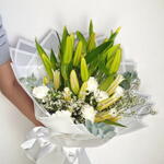 A graceful bouquet radiating purity and elegance. The majestic white lilies, complemented by delicate white blooms and lush greenery, make this arrangement a timeless classic for any occasion — whether it’s a wedding, anniversary, or a token of sympathy. To keep your bouquet fresh, place it in a clean vase with cool water. Change the water daily, trim the stems diagonally every 2–3 days, and remove any leaves below the waterline. Keep the bouquet away from direct sunlight and drafts for prolonged enjoyment.