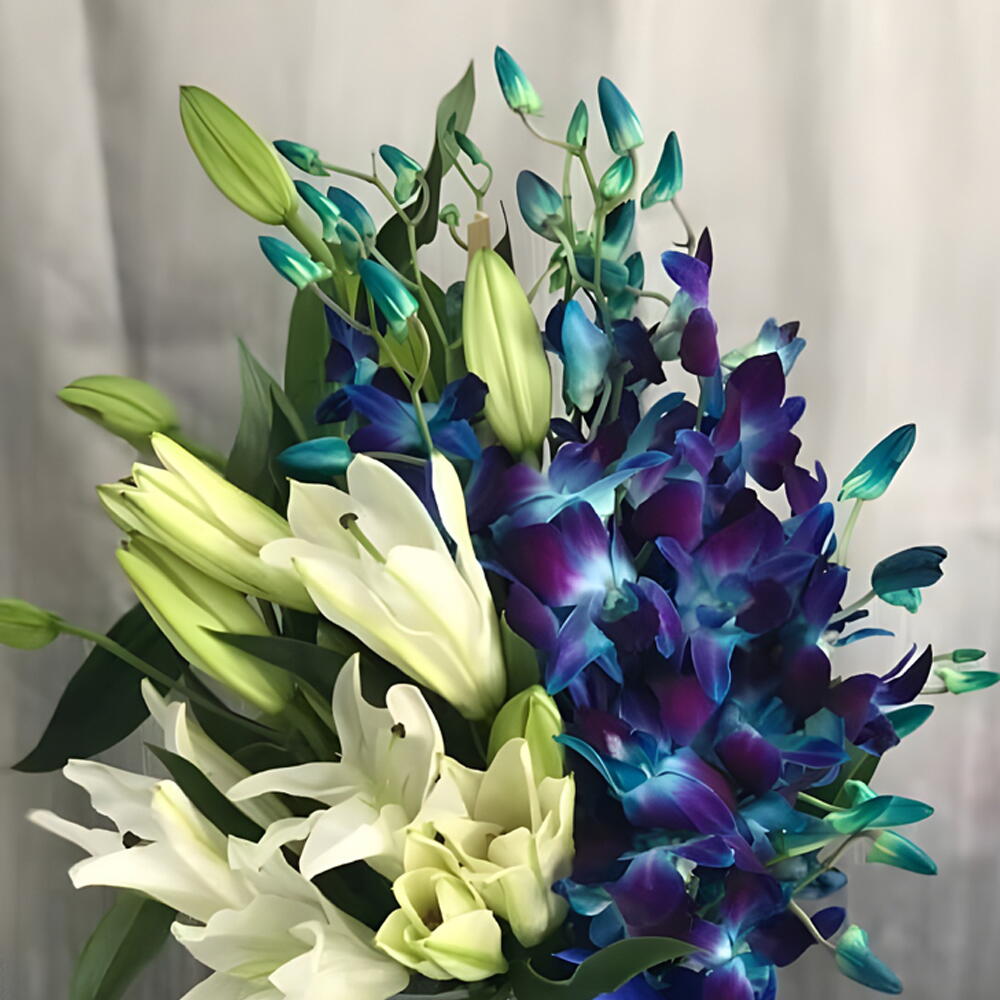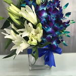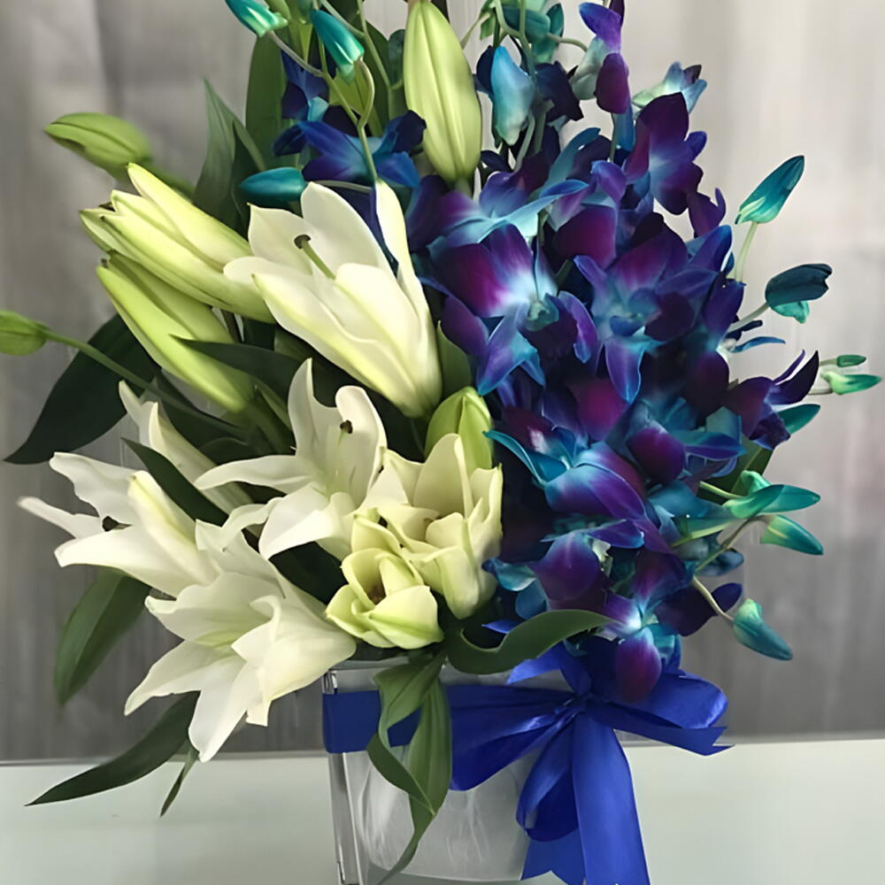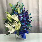 Orchid - 5 pcs glass vase - 1 pcs white lilly - 3 pcs ribbon bow - 1 pcs