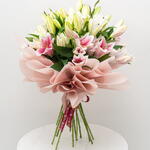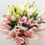 A beautiful lily duet featuring ten pristine white lilies and ten delicate pink lilies. This elegant pairing creates a harmonious balance of color and fragrance.