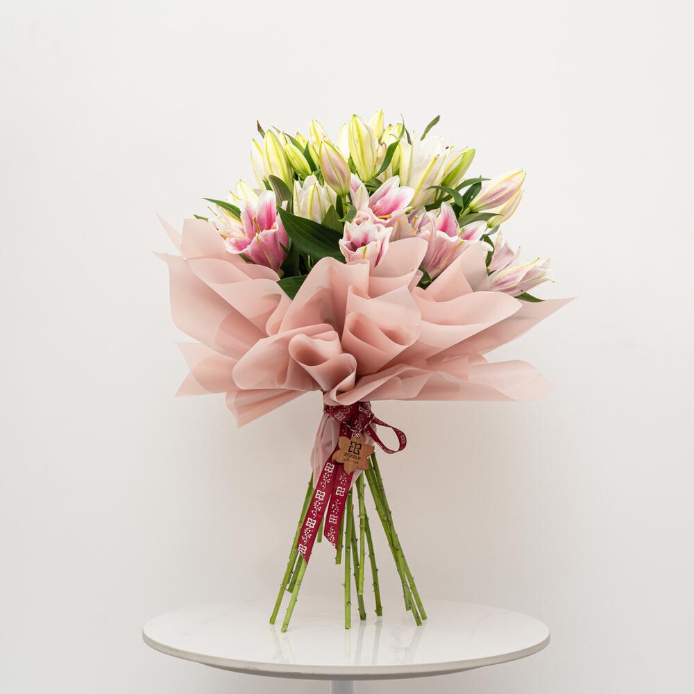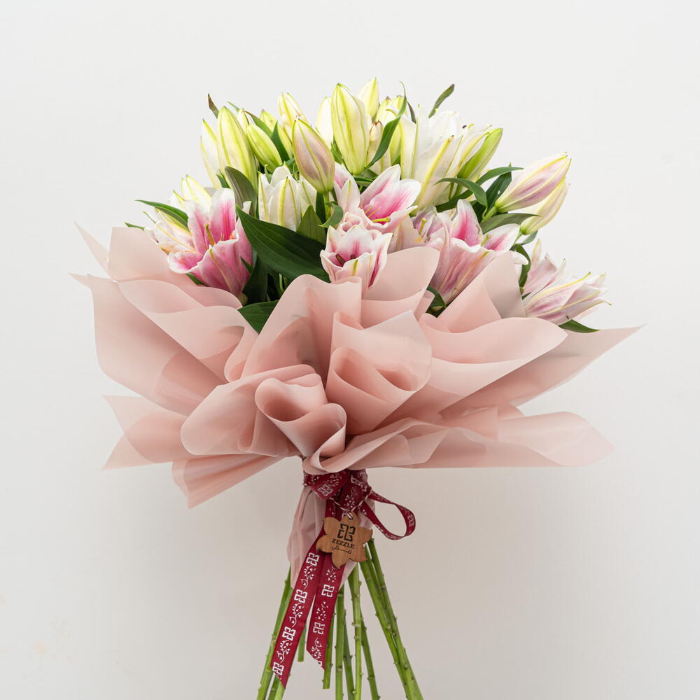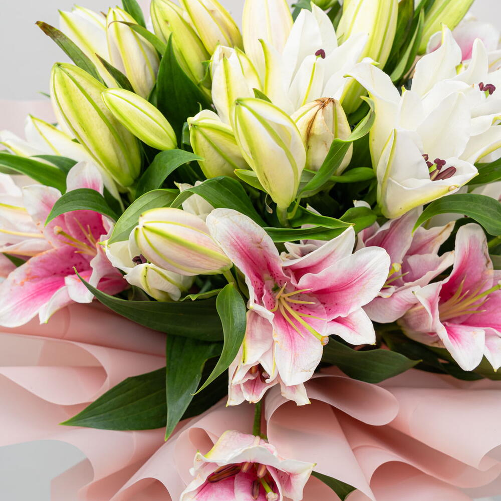 A beautiful lily duet featuring ten pristine white lilies and ten delicate pink lilies. This elegant pairing creates a harmonious balance of color and fragrance.