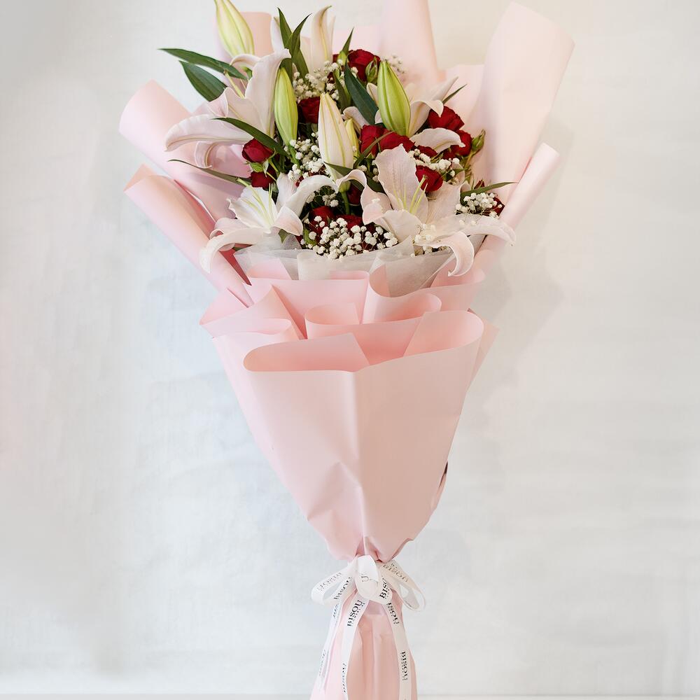 Bouquet of 4 stems of white lilies and 9 stems of red spray roses with fillers in a nice wrapping