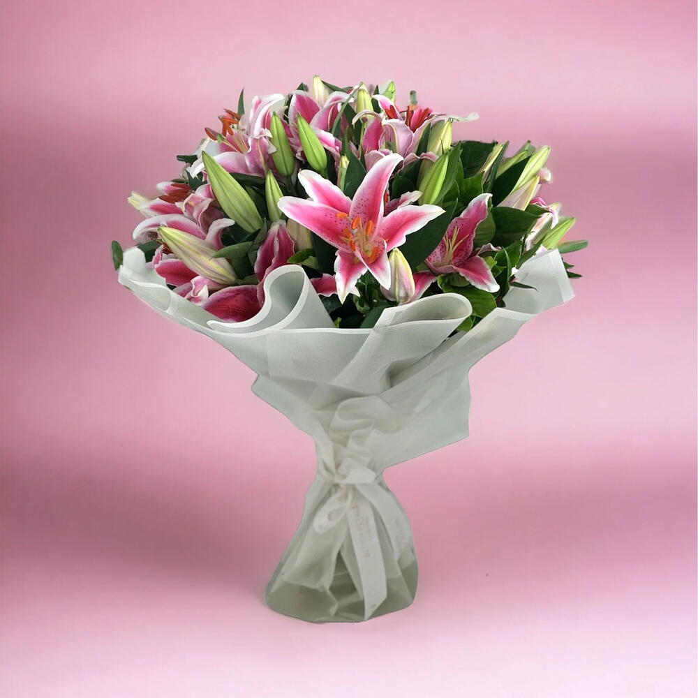 Introducing our magnificent lilies Bouquet of 10 resplendent pink lilies, meticulously curated to evoke an enchanting symphony of beauty and grace. Each delicate blossom, arranged with unparalleled artistry and infused with heartfelt love, harmoniously dances together, creating a mesmerizing spectacle that truly captivates the senses.