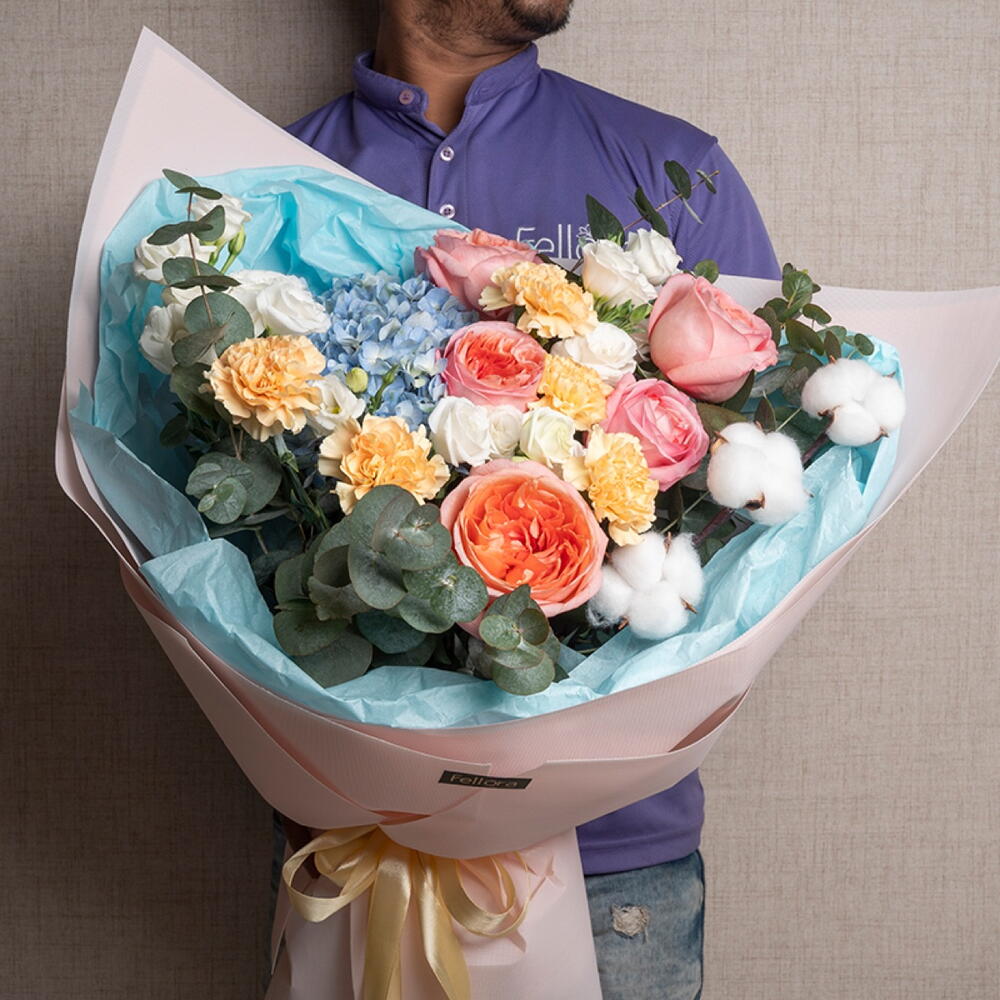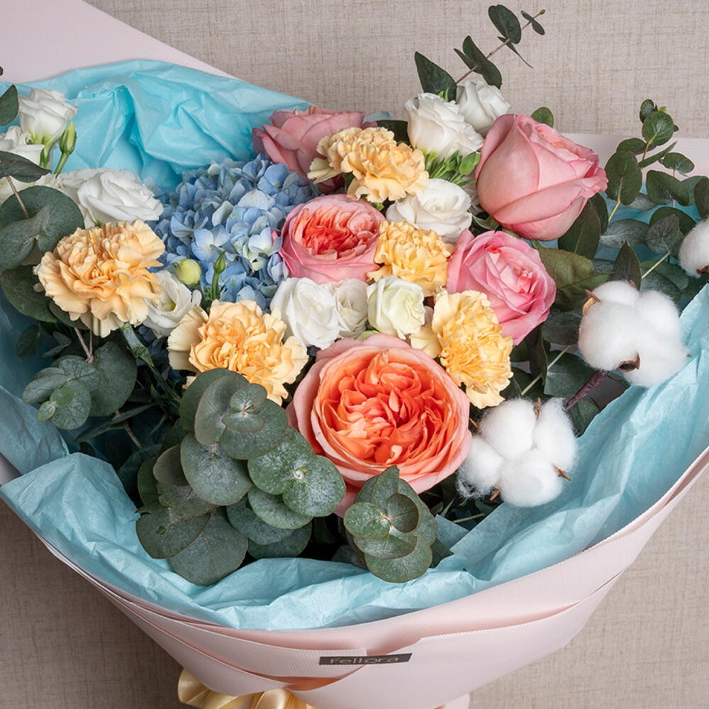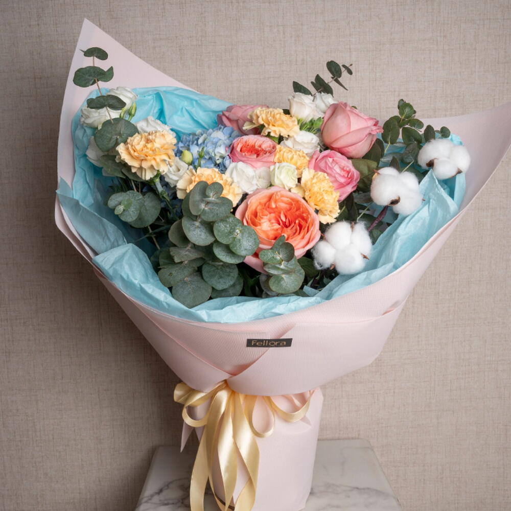 carnation - 5 pcs lisianthus white - 4 pcs ribbon satin - 1 pcs blue hydrangea - 1 pcs white cotton dried flowers - 3 pcs eucalyptus leaves - 5 pcs pink expresion garden rose - 5 pcs decoration wrapping - 5 pcs