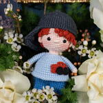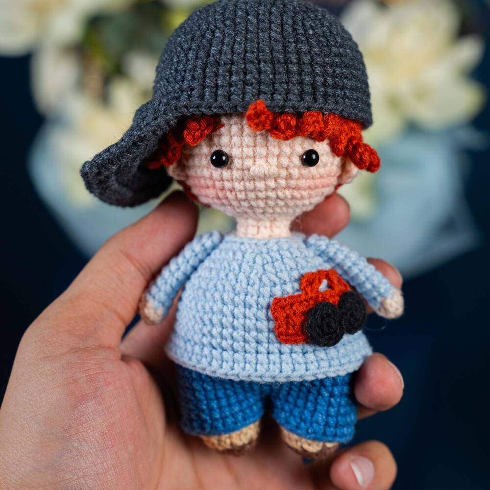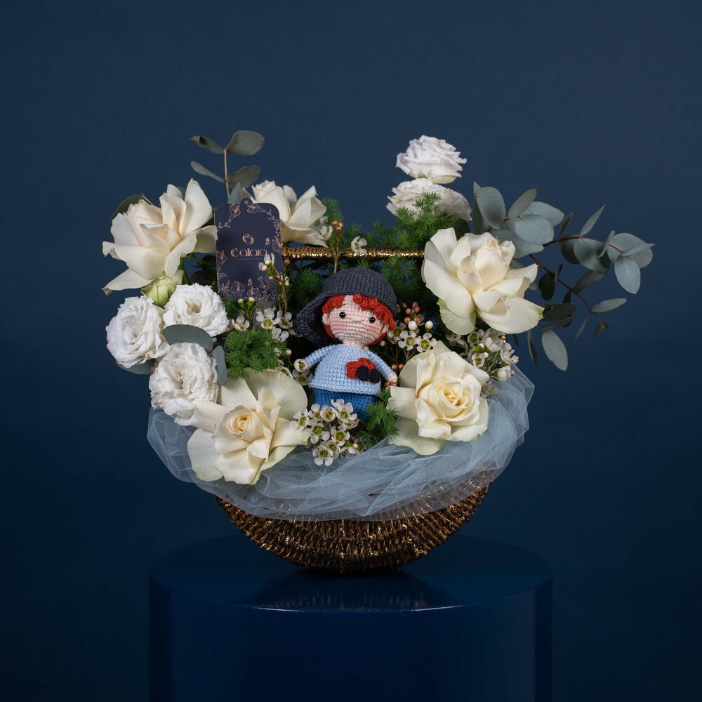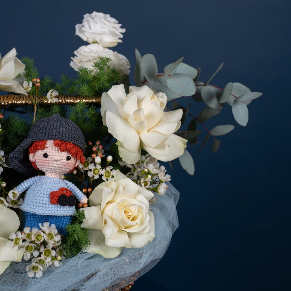 Eucalyptus - 1 pcs White rose - 5 pcs Teddy bear - 1 pcs Eustoma white - 2 pcs asparagus - 1 pcs wax white - 1 pcs organza blue - 1 pcs