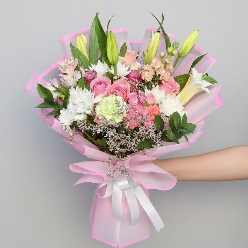 This delicate bouquet in soft pink, creamy white, and light green tones radiates tenderness, elegance, and freshness. Perfect for birthdays, anniversaries, engagements, Mother’s Day, baby showers, graduations, or simply brightening someone’s day, it creates a warm and joyful impression. The arrangement features lush roses, airy spray roses, white chrysanthemums, and graceful lilies that add height and sophistication. Alstroemeria and delicate decorative fillers bring lightness and texture, while rich greenery completes the bouquet with natural charm. To keep the flowers fresh longer, place the bouquet in cool, clean water immediately after receiving. Trim each stem by 1–2 cm daily and remove any leaves below the waterline. Keep the bouquet away from direct sunlight and heat sources to enjoy its beauty for many days.