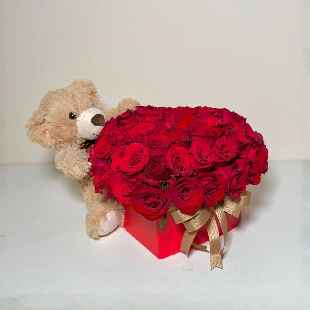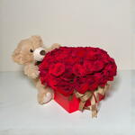 Teddy bear - 1 pcs heart box - 1 pcs red roses - 50 pcs