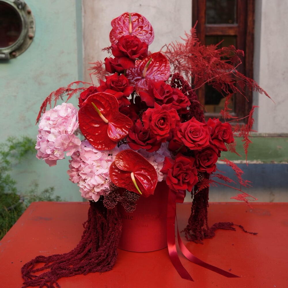 Anthurium - 4 pcs asparagus - 5 pcs amaranthus - 5 pcs pink hydrangeas - 4 pcs red french roses - 13 pcs