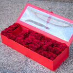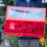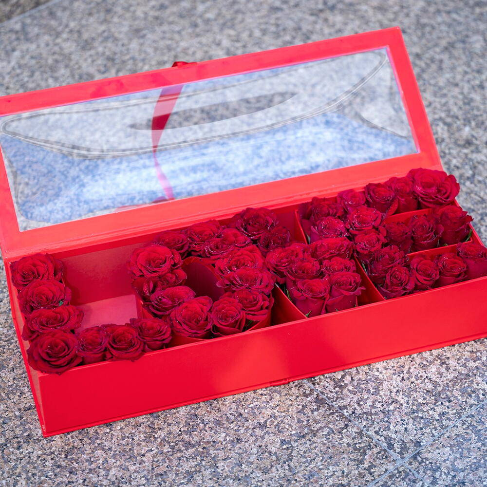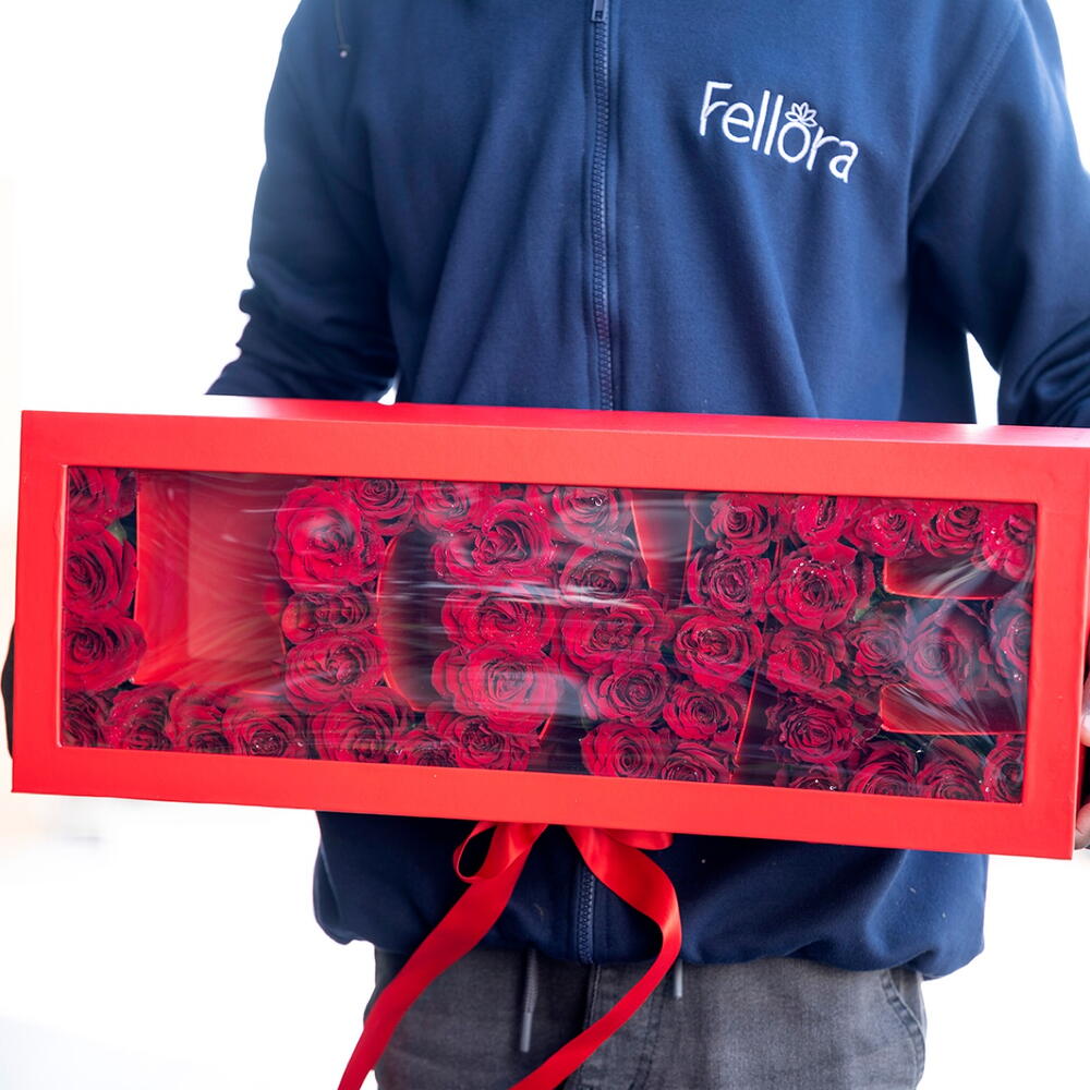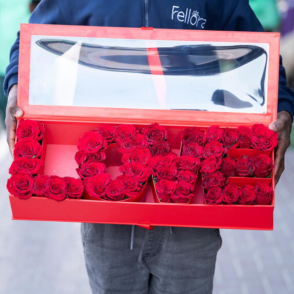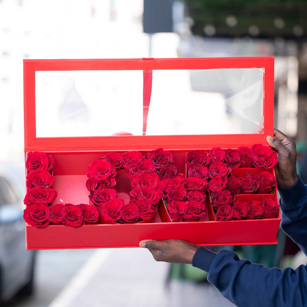 40 to 45 red roses arranged in a ‘Love’ letter designed box