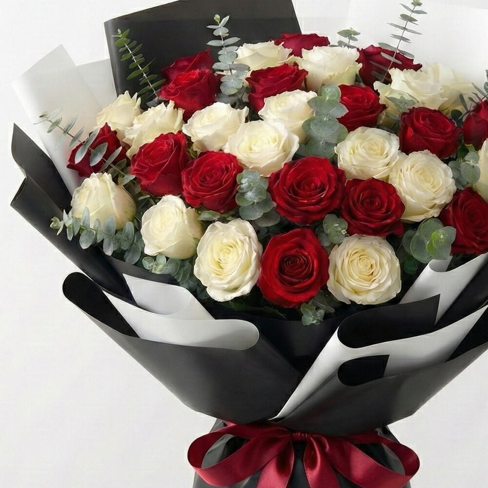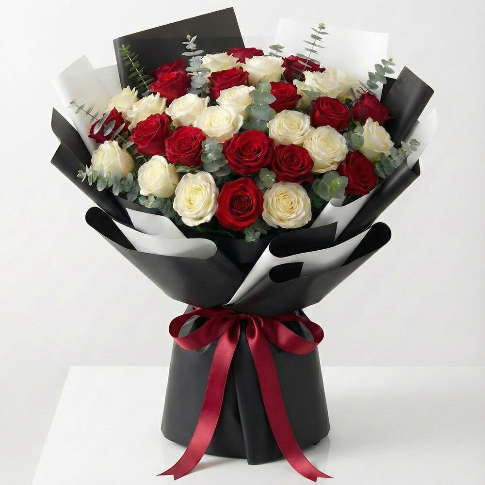 Love Chess 51 Red White Roses with Eucalyptus | Black White Wrap Description A game of contrasts, played perfectly. Love Chess features 51 premium red and white roses, symbolising passion and purity, paired with fresh eucalyptus for a modern, aromatic touch. Finished in a sleek black white wrap, this bouquet is bold, balanced, and irresistibly elegant—just like love when both hearts move in sync. Perfect For • Valentine’s Day ♟️❤️ • Anniversaries milestone moments • Power couples modern romantics • Luxury gifting with meaning Style Notes • Rose count: 51 red white roses • Foliage: Fresh eucalyptus • Wrap: Premium black white • Vibe: Modern • Statement • Sophisticated