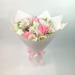 alstroemeria white - 5 pcs tulip white - 9 pcs carnation pink - 5 pcs lisianthus white - 5 pcs limonium pink - 5 pcs
