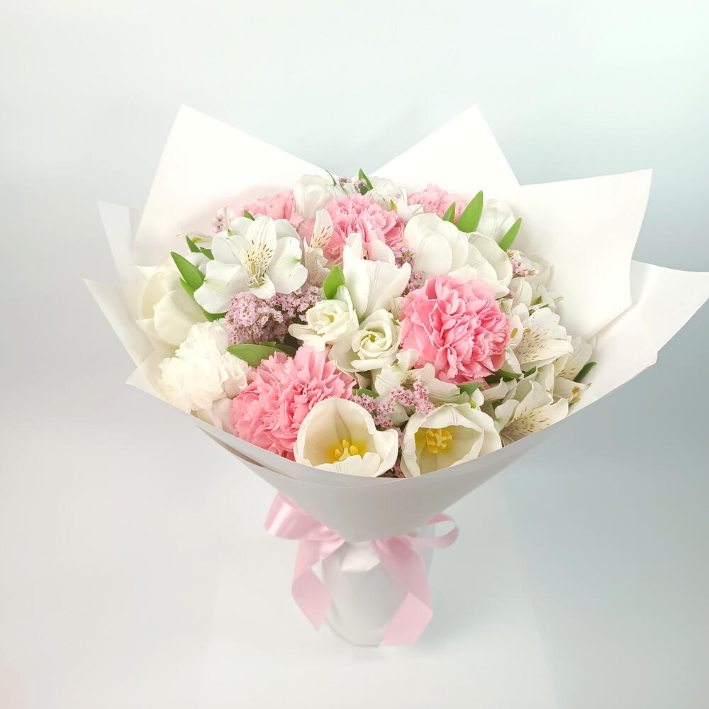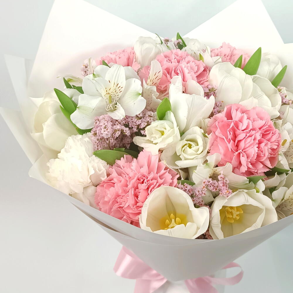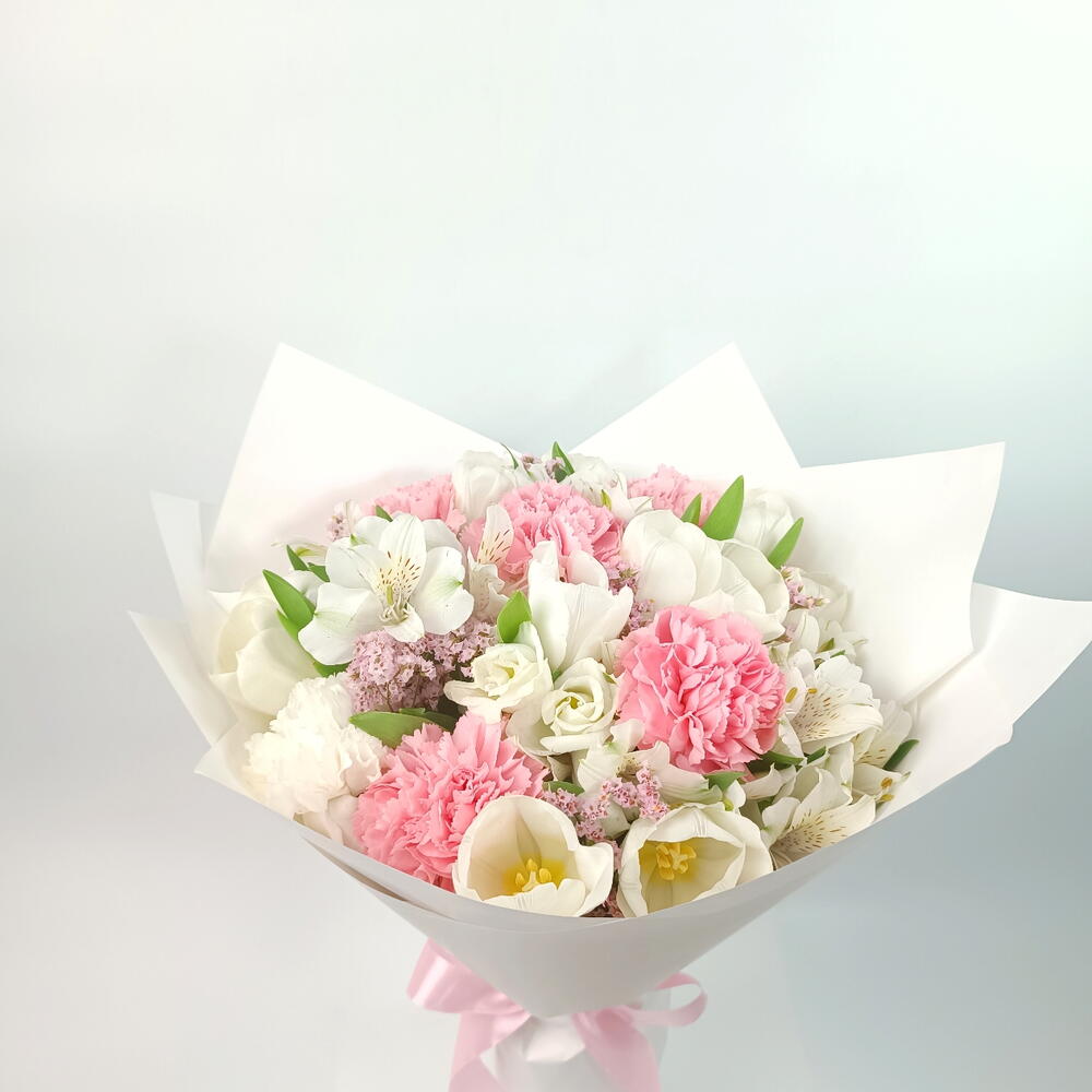 alstroemeria white - 5 pcs tulip white - 9 pcs carnation pink - 5 pcs lisianthus white - 5 pcs limonium pink - 5 pcs
