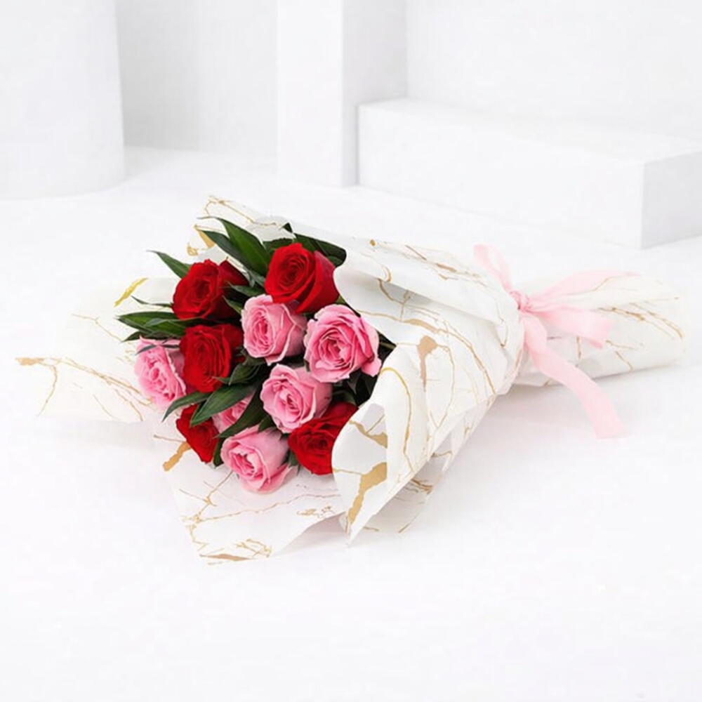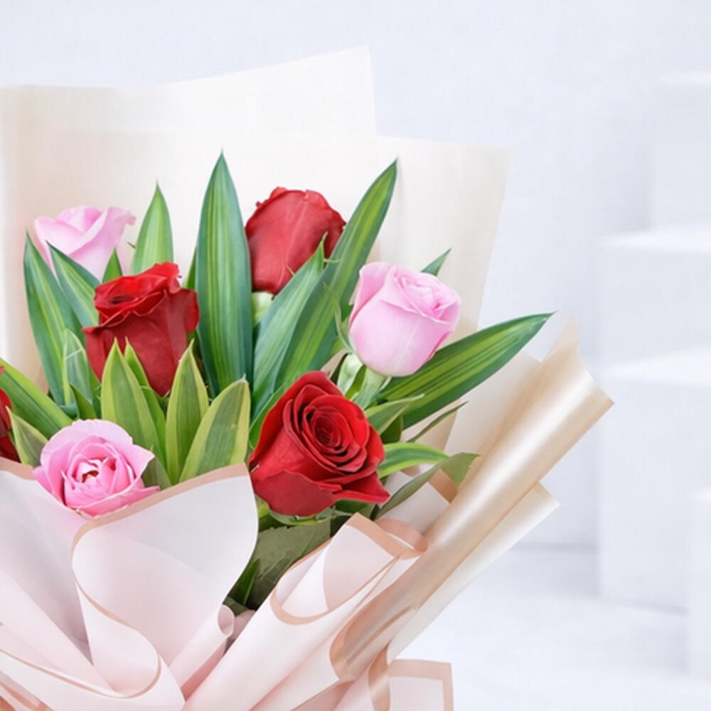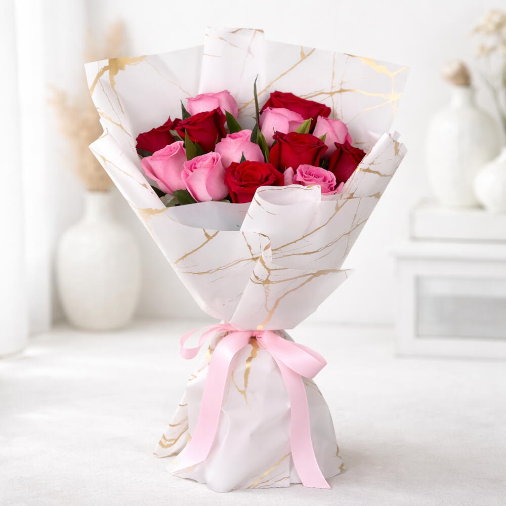 6 Pink Roses 5 Red Roses 2 Songs of Jamaica Leaves Wrapped in Pink Marble Wrapping Tied with Pink Ribbon