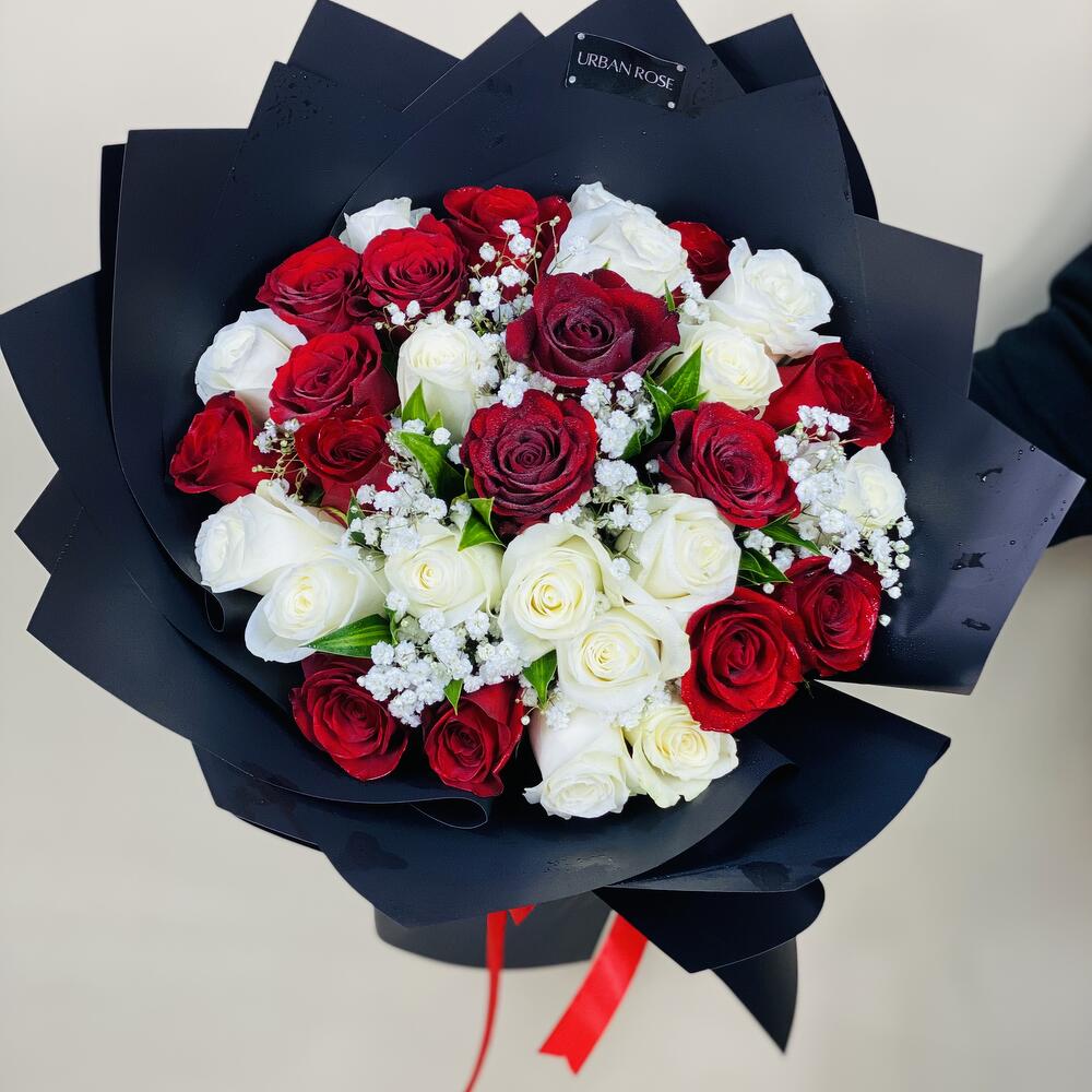 Mix of white roses and red roses in a black elegant wrapping