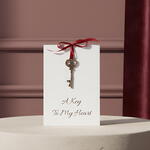 A romantic keepsake featuring a vintage bronze key tied with a red ribbon, presented on a white card inscribed with “A Key To My Heart.” A heartfelt add-on to any bouquet or gift, perfect for expressing deep love and devotion.