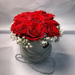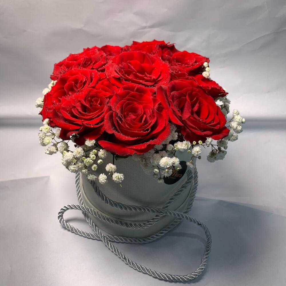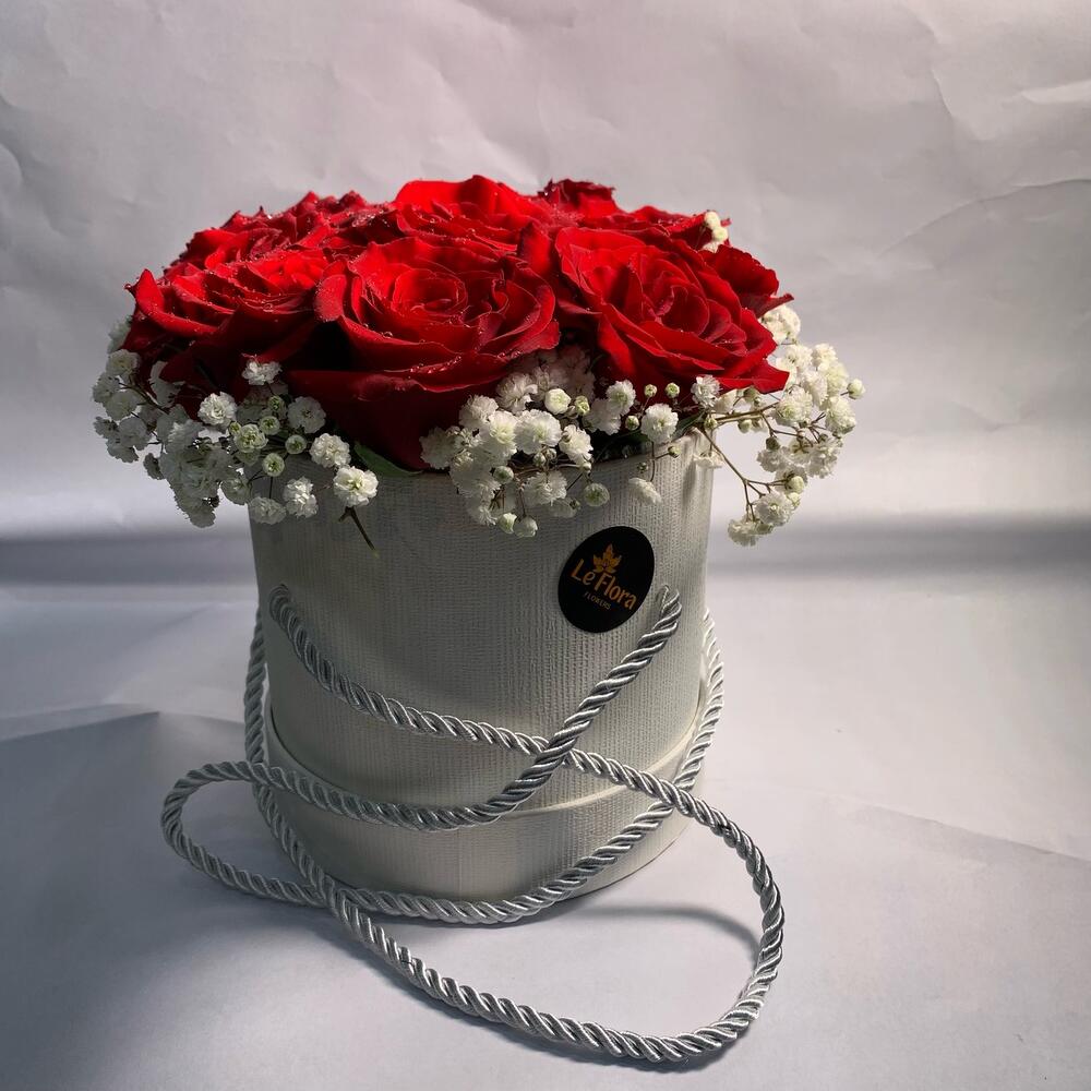 Red rose along with fillers arranged by white small round box