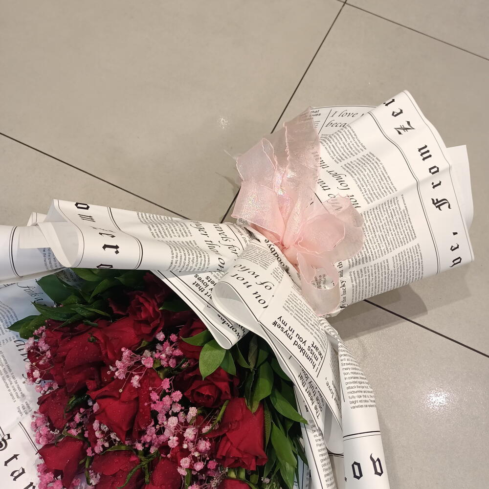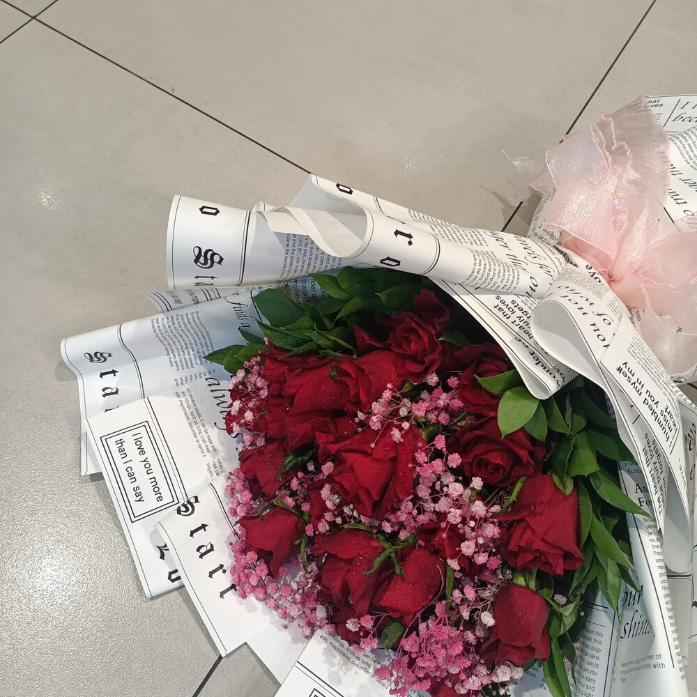 A romantic bouquet of vibrant red roses, accented with delicate pink babys breath, wrapped in unique paper printed with newspaper-style text and phrases like I love you more than I can say. A soft pink netting adds a gentle touch.