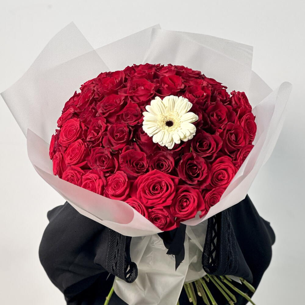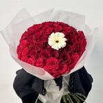 This striking arrangement features 50 bold red roses, symbolizing love and passion, beautifully centered around a single white gerbera, adding a touch of elegance and contrast. Wrapped in transparent white paper, the bouquet exudes a clean, sophisticated look that highlights the vibrant red roses and the delicate white gerbera. A perfect blend of romance and simplicity, this arrangement makes for a stunning gift or centerpiece for any special occasion.