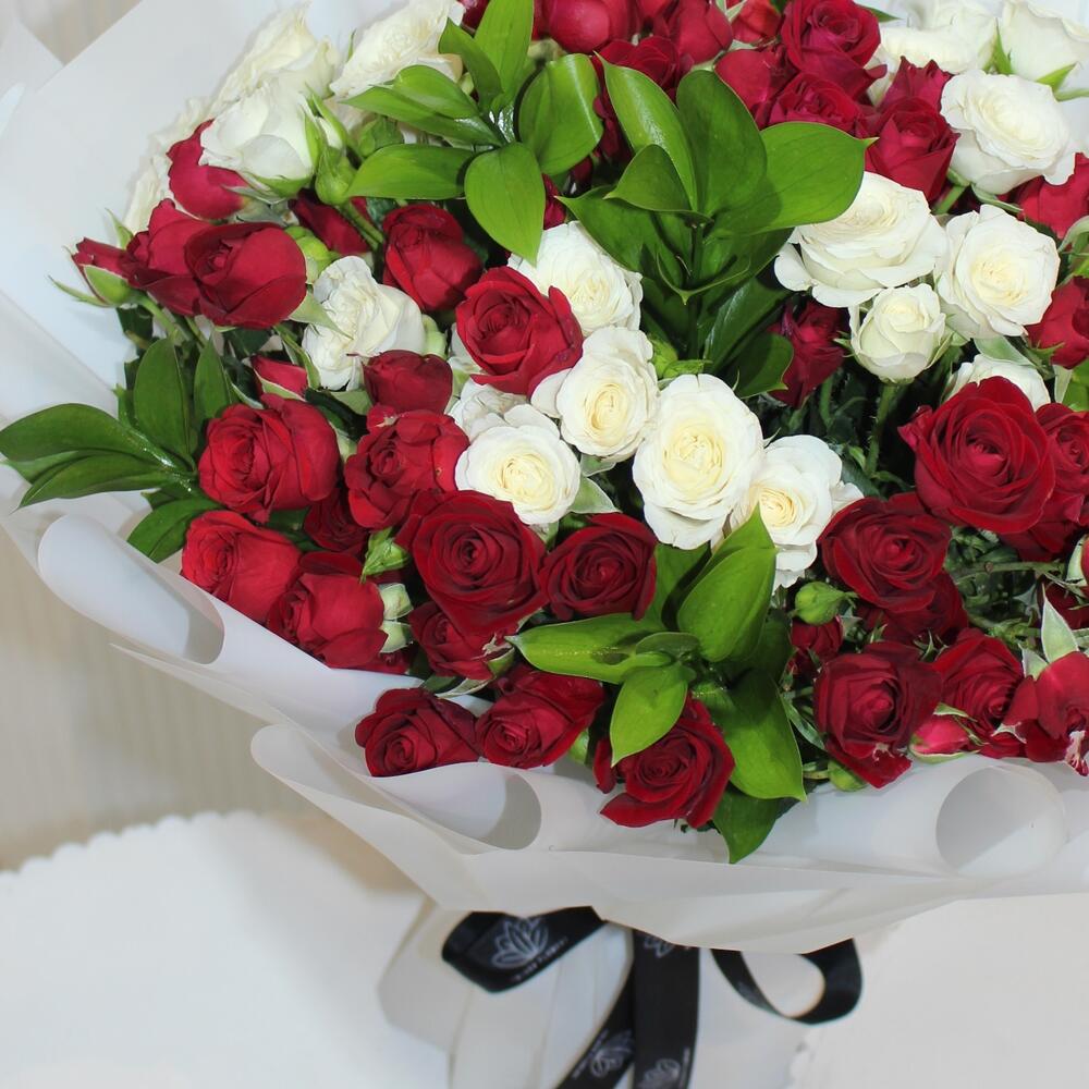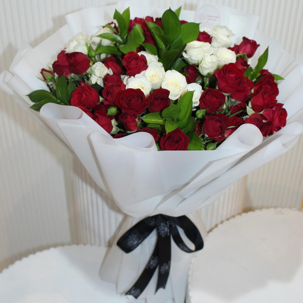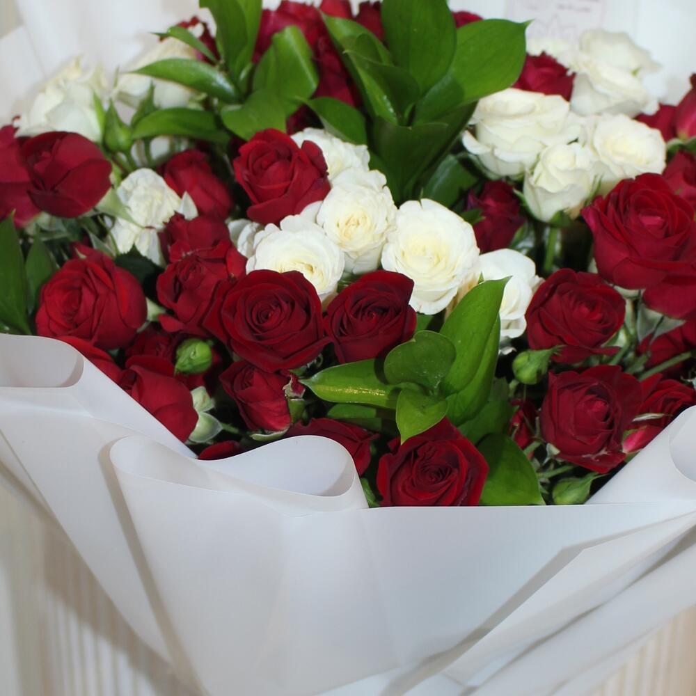 Green leaves - 10 pcs red spray roses - 31 pcs white spray roses - 20 pcs