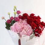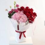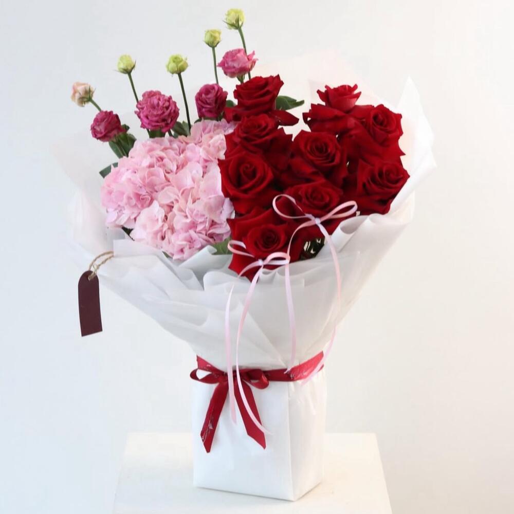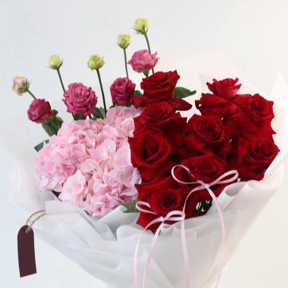 Love Story Celebrate romance with Love Story, a bouquet designed to capture the essence of affection and elegance. This charming arrangement features: • 3 Pink Hydrangeas – soft, romantic blooms that symbolize heartfelt emotions • 10 Red Roses – classic expressions of love and passion • 5 White Spray Roses – delicate touches of purity and grace • 5 Pink Spray Roses – gentle accents of sweetness Wrapped in pristine white paper and adorned with 2 stylish pink bows and a white wrap with red ribbon, this bouquet is finished with a Florish special design, making it a perfect gift for someone you adore.