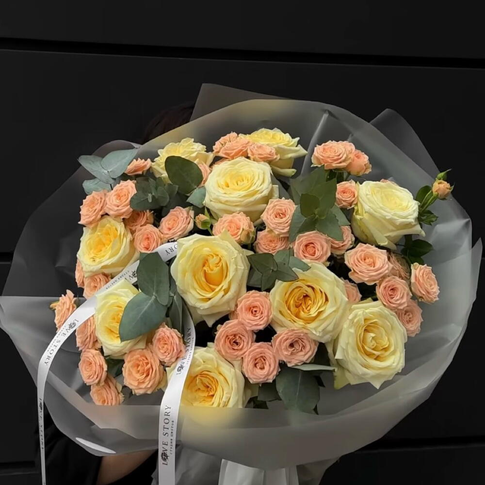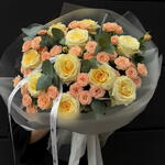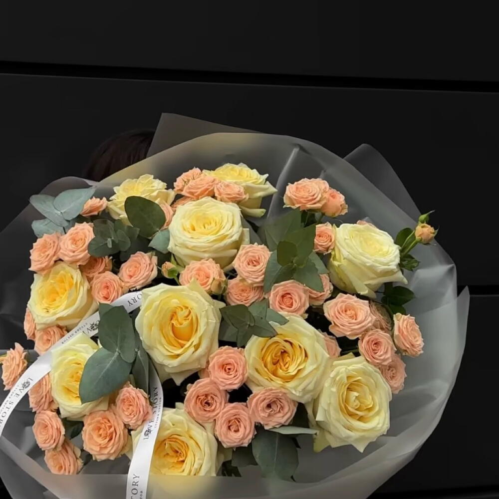 Eucalyptus - 5 pcs Spray rose - 12 pcs garden rose - 10 pcs wrapping paper - 5 pcs ribon - 2 pcs