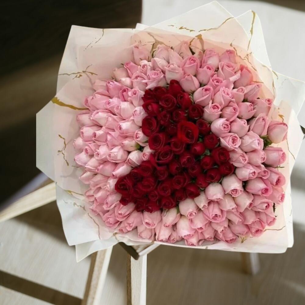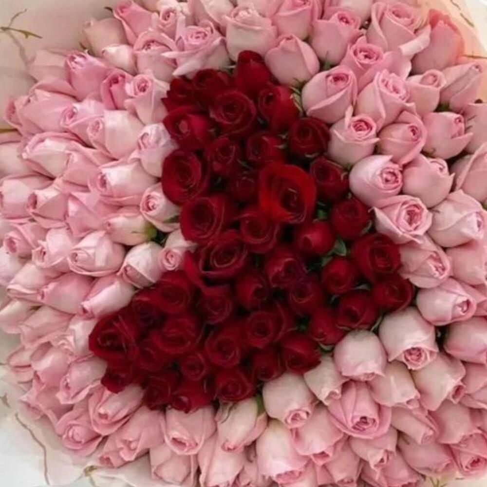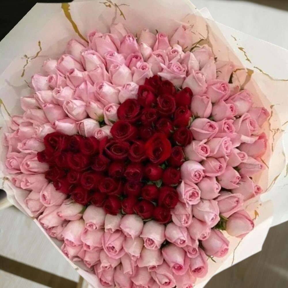 This luxurious bouquet is made up of delicate *light pink roses* surrounding a bold *red rose heart shape* in the center. The contrast between the soft pink and deep red creates a romantic and visually stunning design, symbolizing pure admiration wrapped around deep love. Perfect for anniversaries, proposals, Valentines Day, or any heartfelt occasion.
