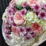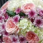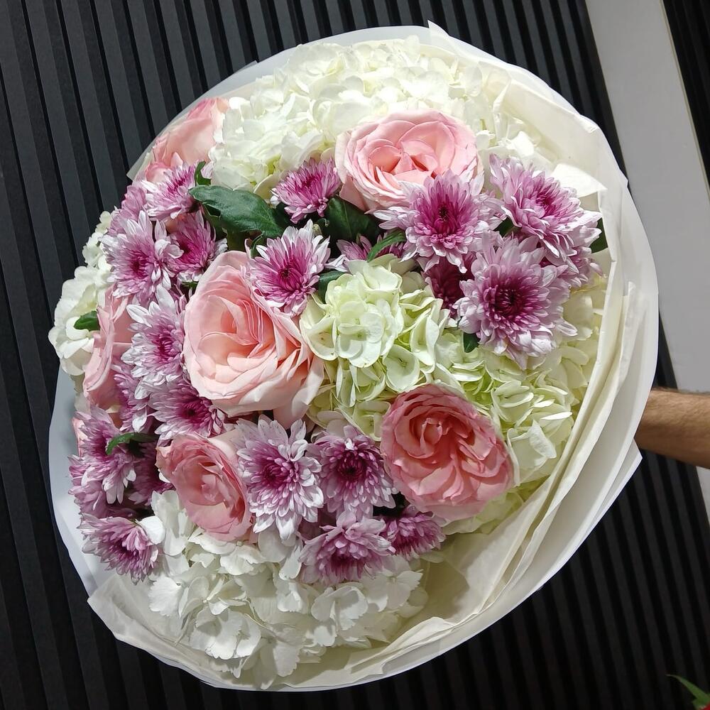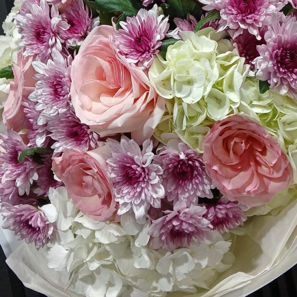 white hydrangea - 4 pcs pink chrysanthemum - 6 pcs pink roses - 7 pcs
