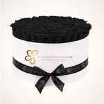 Product Details Arrangement of 90 to 120 Black Roses in XXL White Round Box and tied with Black Ribbon.