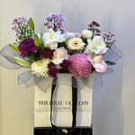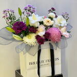 That’s a lovely floral arrangement! 🌸 It features a soft and elegant mix of white, cream, pink, and purple blooms arranged in a Brillante Flowers Abu Dhabi signature bag. The composition includes: