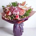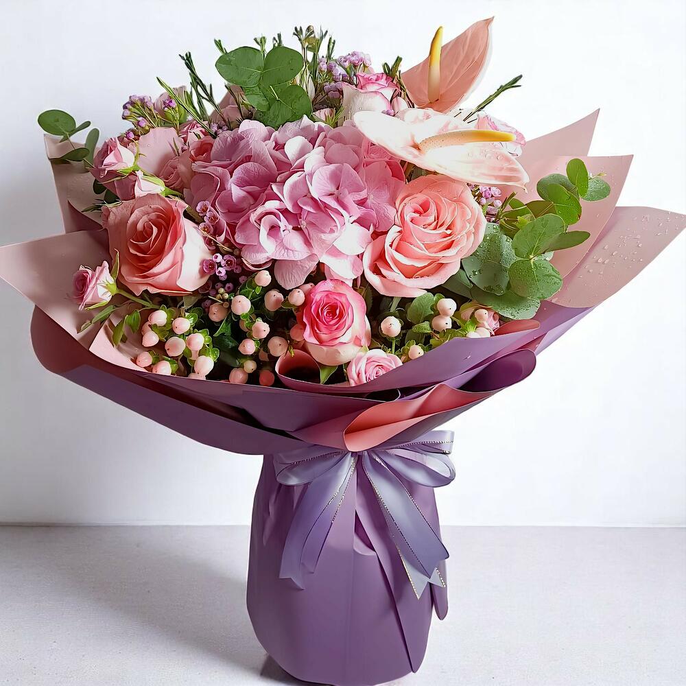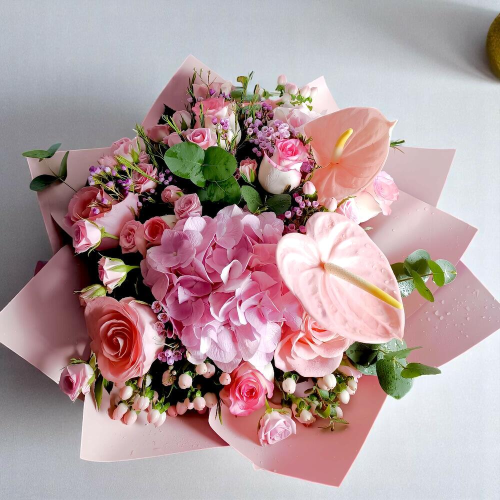 hermosa - 5 pcs spray pink rose - 5 pcs cinerea eucalyptus - 5 pcs wax pink - 3 pcs anthurium pink - 2 pcs hypericum pink - 3 pcs hydrenga pink - 2 pcs jumila - 5 pcs
