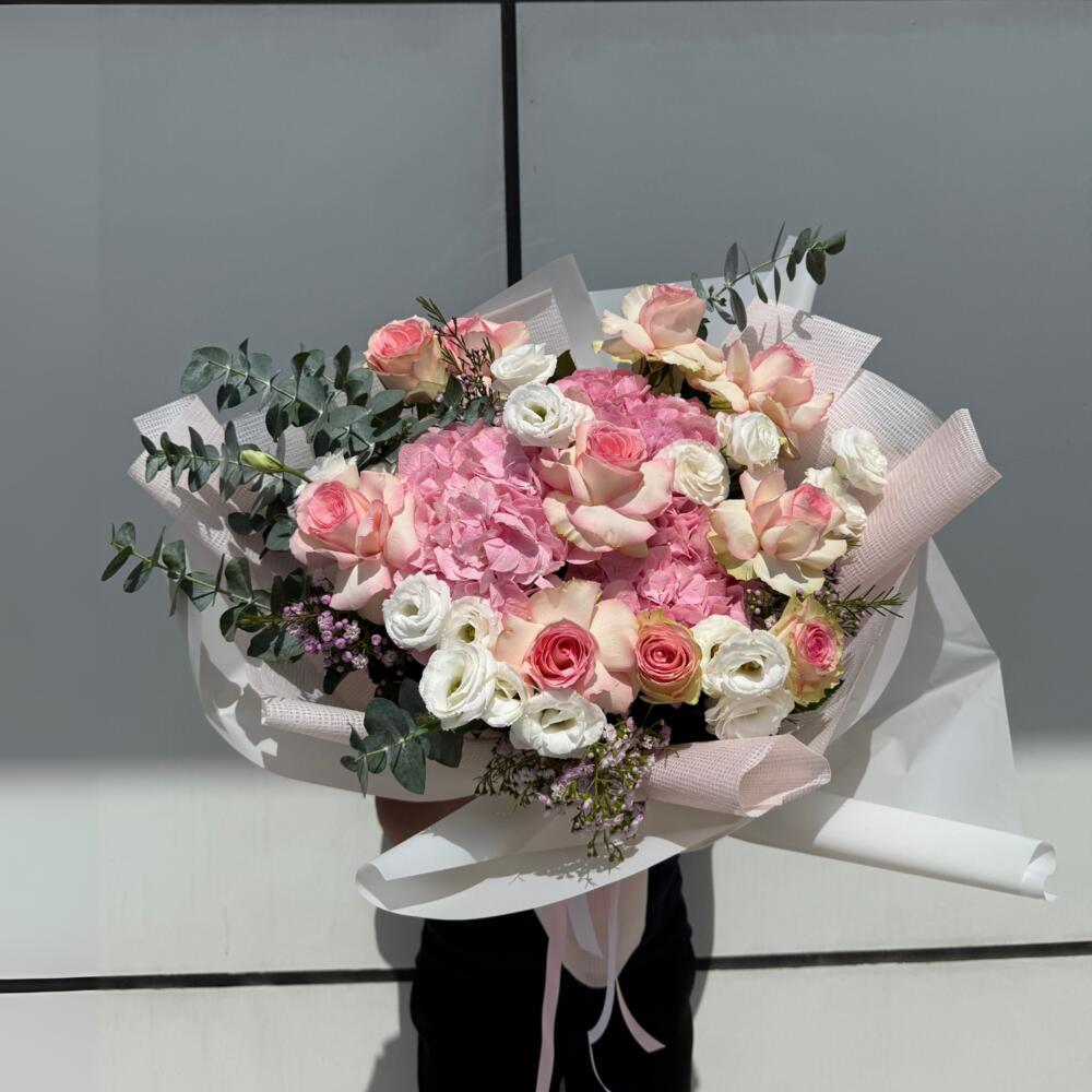 A luxurious arrangement of 12 Esperance roses, 6 white lisianthus, 3 pink hydrangeas, 5 wax flowers, and 8 stems of eucalyptus. This graceful mix blends romance, purity, and freshness, making it a perfect gift for birthdays, anniversaries, or elegant celebrations